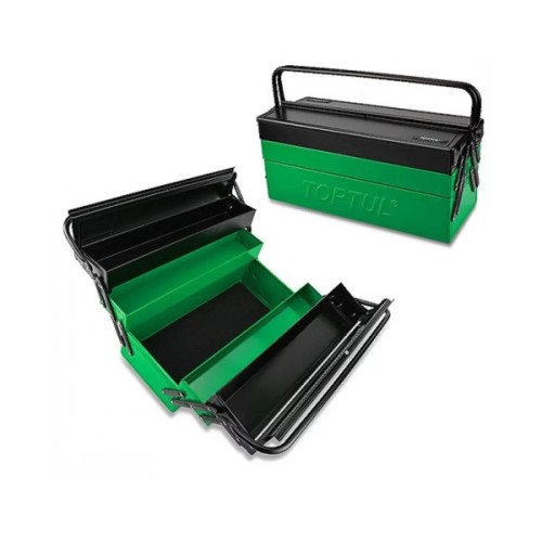 Ящик для інструменту TOPTUL є універсальним і зручним засобом перенесення та зберігання різного слюсарного інструменту. Ящик складається з 5 розсувних секцій великого об'єму для зберігання. Зверху ящика розміщена зручна та міцна ручка для перенесення. Ящик для інструменту Топтул виготовлений із міцного металу, завдяки чому ящик стійкий до фізичного впливу та деформації. Нижня полиця 5-секційного ящика покрита спеціальною прокладкою. Розкривні стулки мають вушка з отворами, у які можна просунути замок або хомут для запобігання відкриттю ящика під час транспортування.