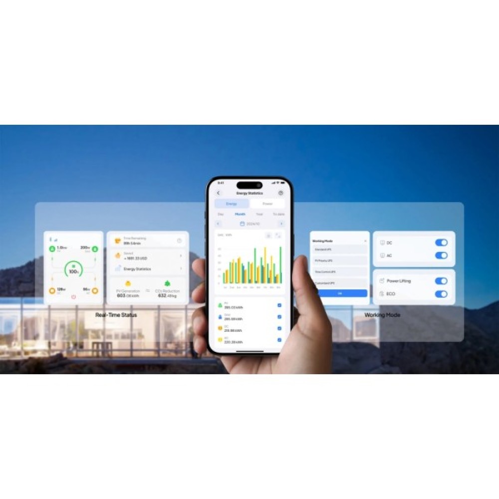 Підтримка Wi-Fi та Bluetooth дозволяє керувати станцією через фірмову мобільну програму. Користувач може контролювати заряд, вибирати режими роботи та стежити за станом обладнання дистанційно.