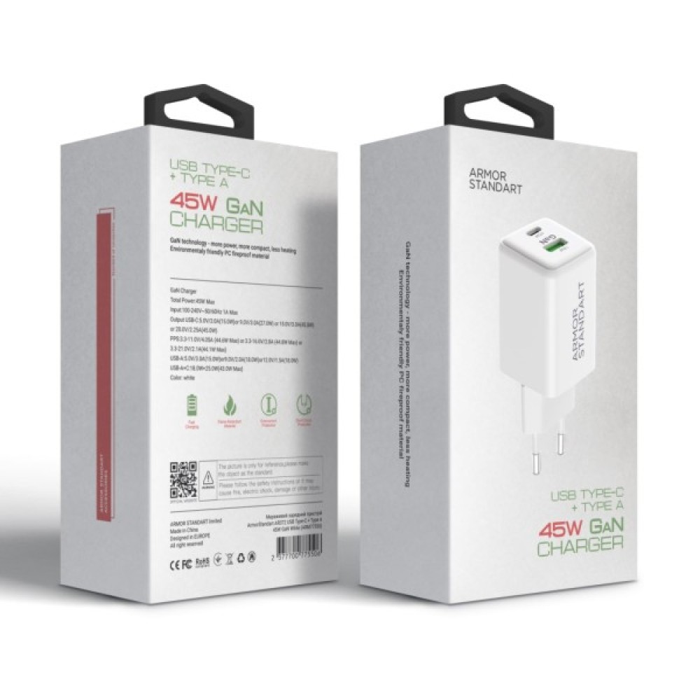 Особливість Armorstandart AR372 полягає у використанні технології GaN (галій нітрид), що робить його компактнішим та легшим, ніж традиційні зарядні пристрої, без втрати потужності. Ця зарядка має максимальну вихідну потужність 45 Вт, що дозволяє швидко заряджати навіть найенергозатратніші пристрої.