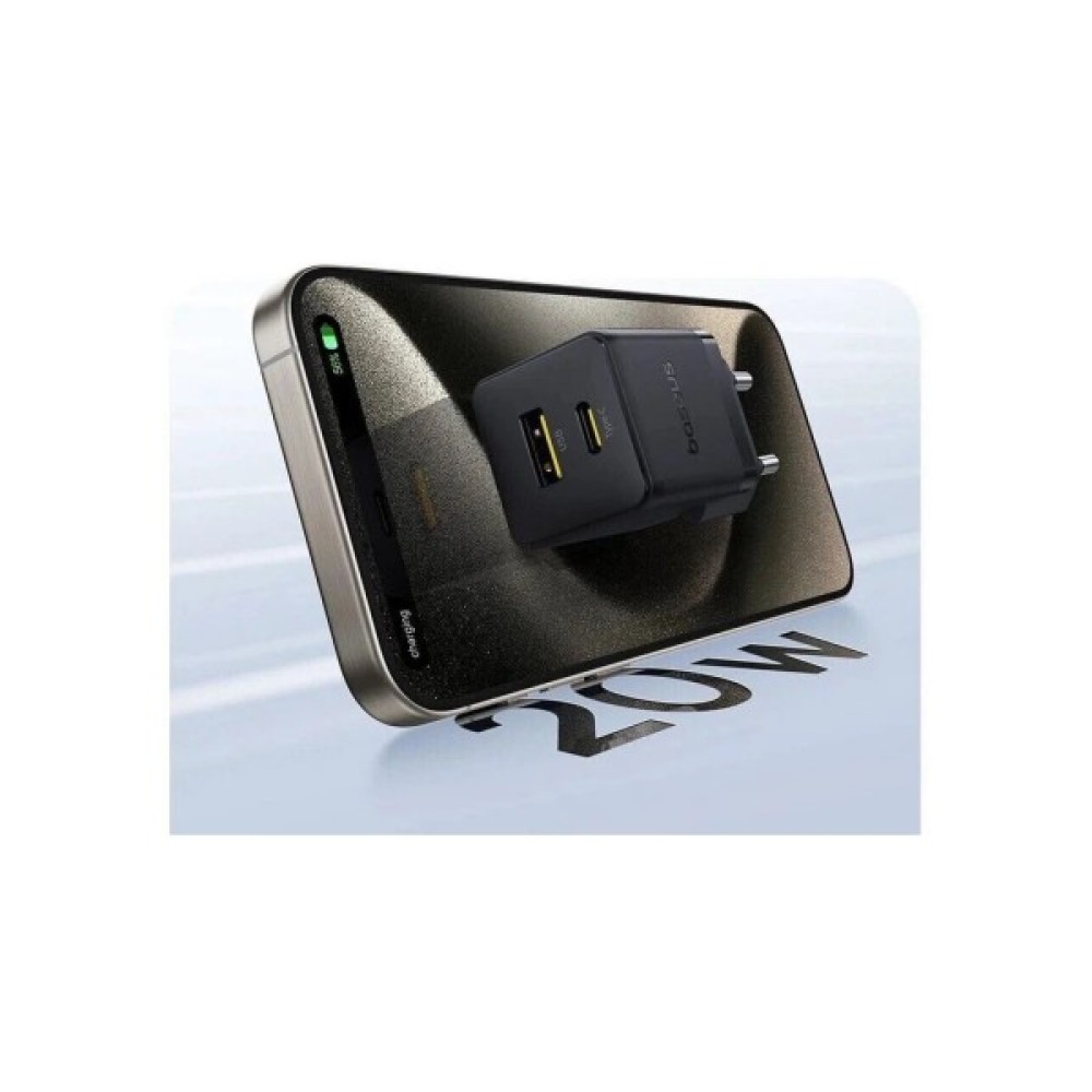 - Подвійний вихід – Type-C (20 Вт) + USB-A для зручної зарядки двох пристроїв.