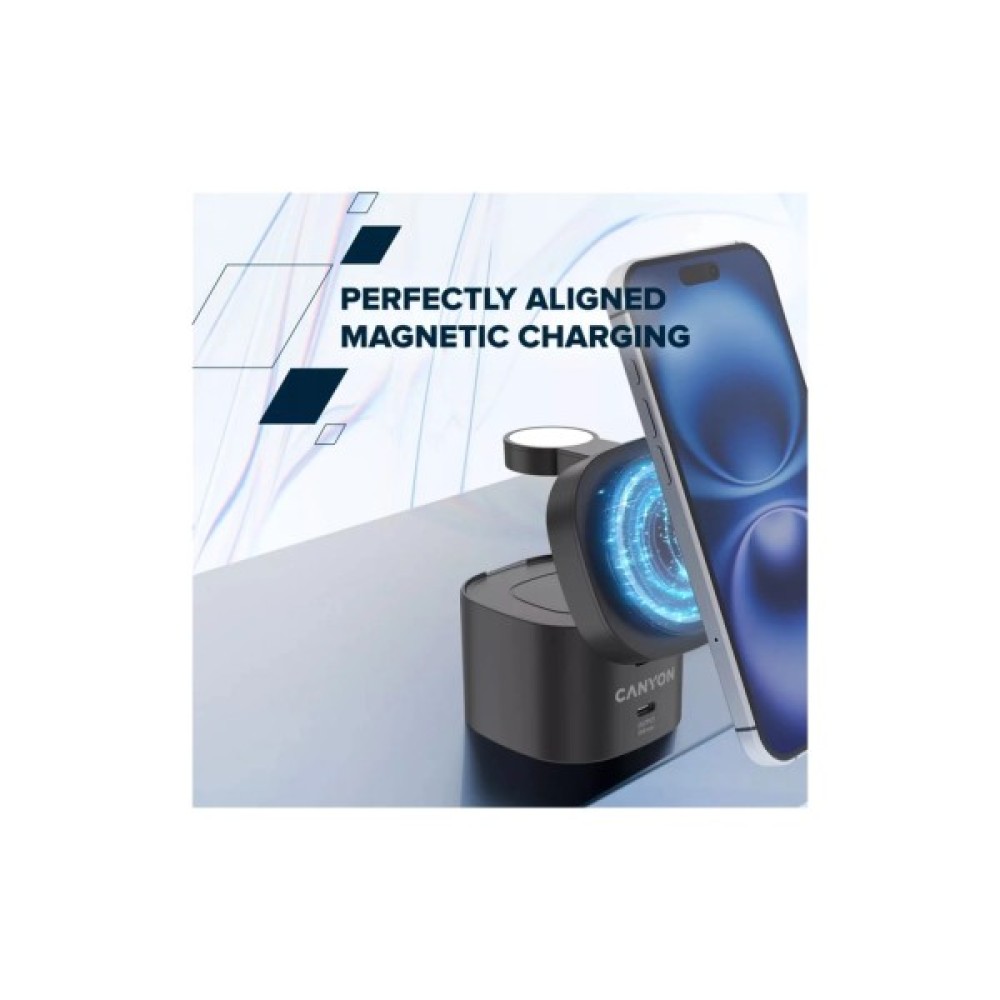 Зустрічайте Canyon 4-in-1 wireless charging stand 30W — революційну бездротову зарядну станцію, що здатна упорядкувати ваш щоденний процес заряджання. Завдяки інтегрованій бездротовій зарядці з сертифікацією Qi2, цей пристрій надає потужність до 15 Вт для смартфонів iPhone з MagSafe, забезпечуючи швидку зарядку без жодних дротів. Магнітне вирівнювання гарантує надійність під час використання.