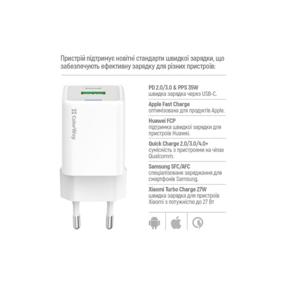 Зарядний пристрій ColorWay GaN Mini 35W PD Port PPS USB (Type-C PD + USB QC4.0) у білому кольорі (CW-CHS055PD-WT) – це ваш новий суперкомпактний і високоефективний надійний помічник. Завдяки передовій технології GaN (нітрид галію), цей пристрій поєднує в собі виняткову потужність і мінімізовані габарити, відзначаючись легкістю та зручністю в користуванні.
