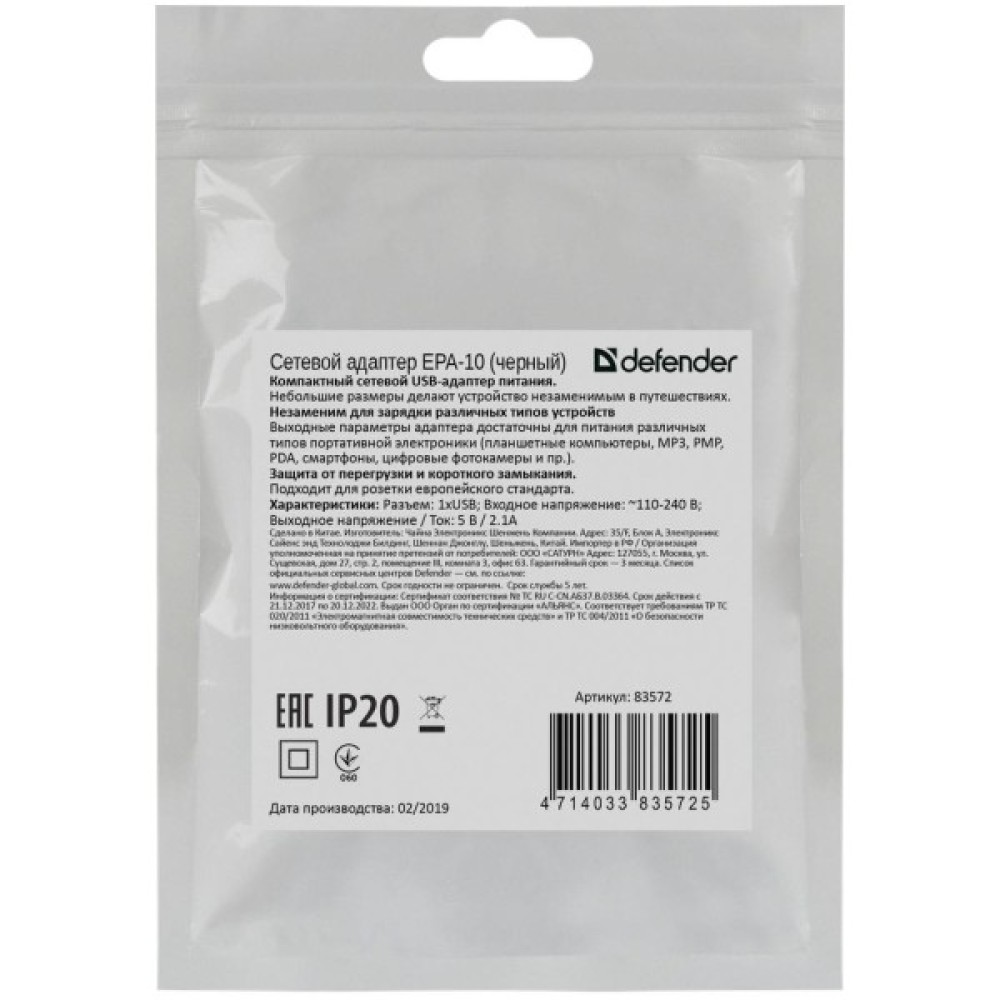 Зарядний пристрій Defender EPA-10 black, 1xUSB, 5V / 2.1A (83572) - це ідеальний вибір для тих, хто шукає надійність і зручність у компактному форматі. Цей мережевий адаптер прекрасно поєднує у собі універсальність та ефективність завдяки своєму вихідному порту USB, що забезпечує максимальний вихідний струм в 2.1 А.