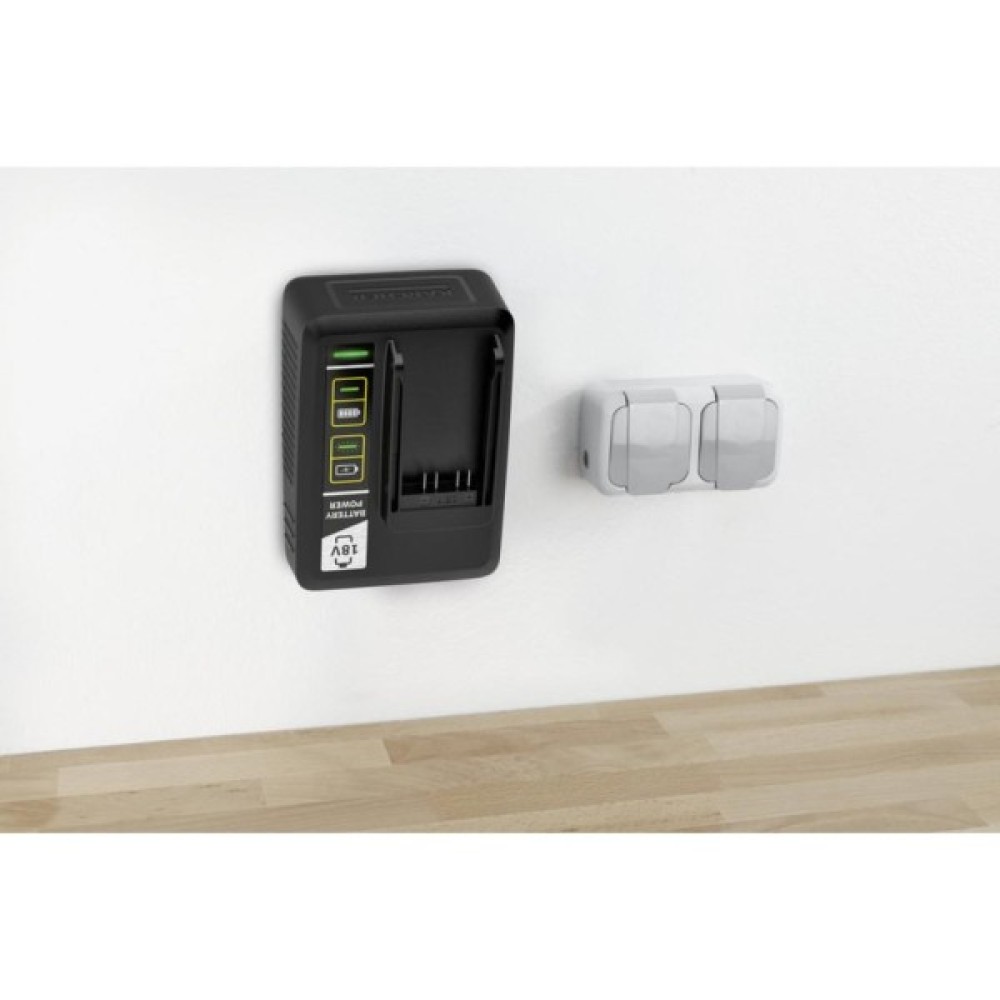 Швидкозарядний пристрій заряджає акумулятор Kärcher 18 В/2.5 А·год до 80% всього за 44 хвилини і може використовуватися для всіх акумуляторів на платформі 18 V Kärcher Battery Power.