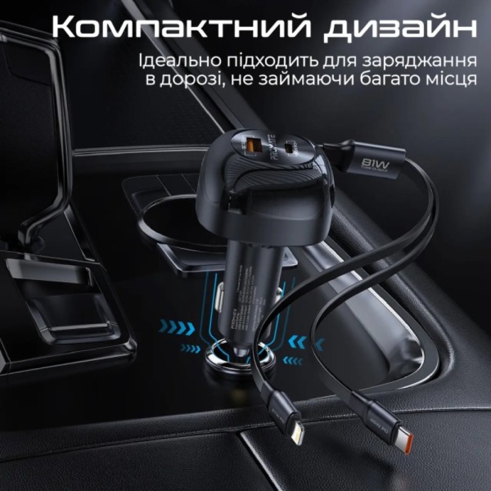 Зарядний пристрій Promate PowerDrive-RCI81 — ваш надійний партнер для швидкого заряджання в автомобілі. Цей пристрій розроблено для тих, хто цінує ефективність та комфорт. Завдяки двом вбудованим кабелям, вам більше не потрібно турбуватись про наявність додаткових дротів у вашому авто.