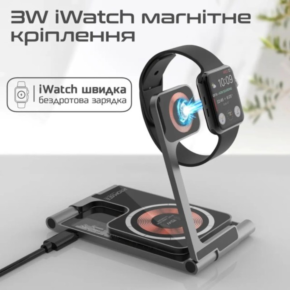Зарядний пристрій підтримує одночасну зарядку трьох пристроїв без втрати якості, що робить його незамінним помічником для тих, хто не уявляє своє життя без кількох гаджетів. Інтегроване магнітне кріплення MagSafe гарантує безпечну фіксацію вашого iPhone, особливо моделей iPhone 12 і новіших. При цьому, AirPods отримують оптимальну потужність 5 Вт, а Apple Watch — 3 Вт.