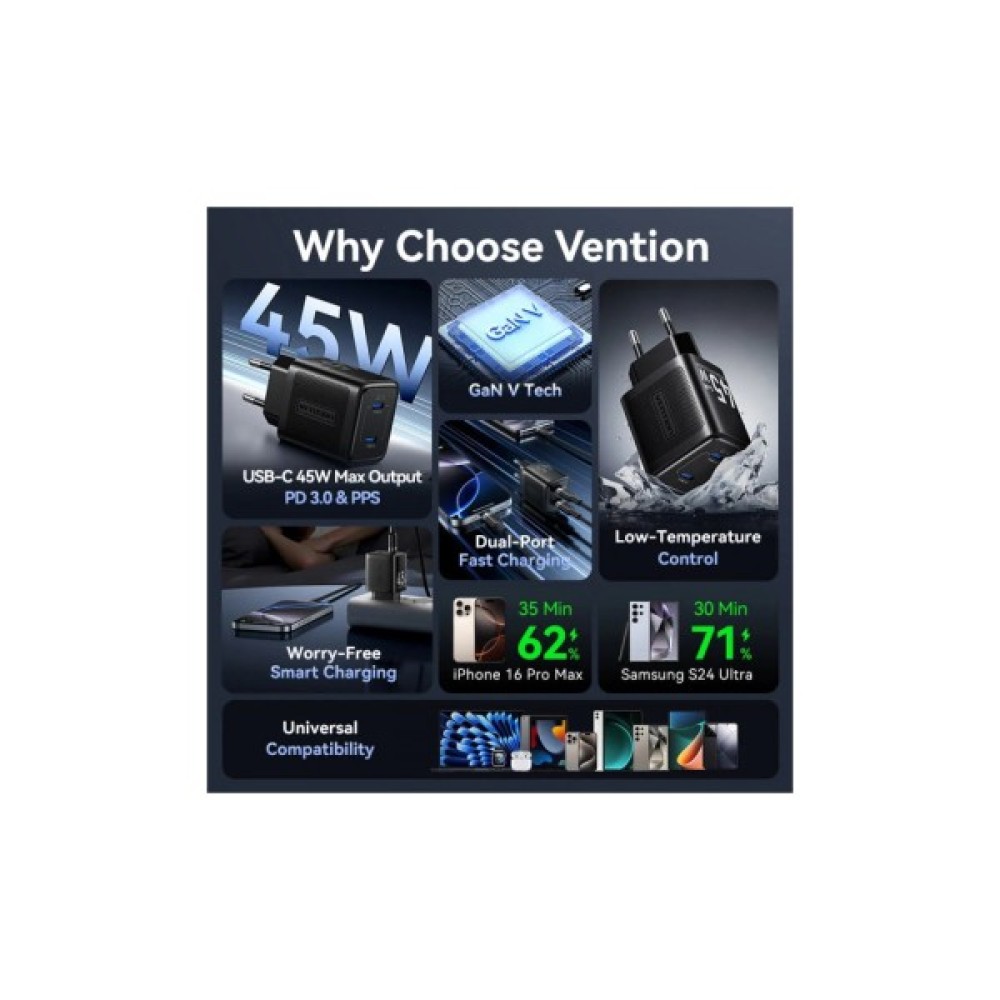 Зарядний пристрій Vention 2xUSB-C PD45W GaN black (FEFB0-EU)