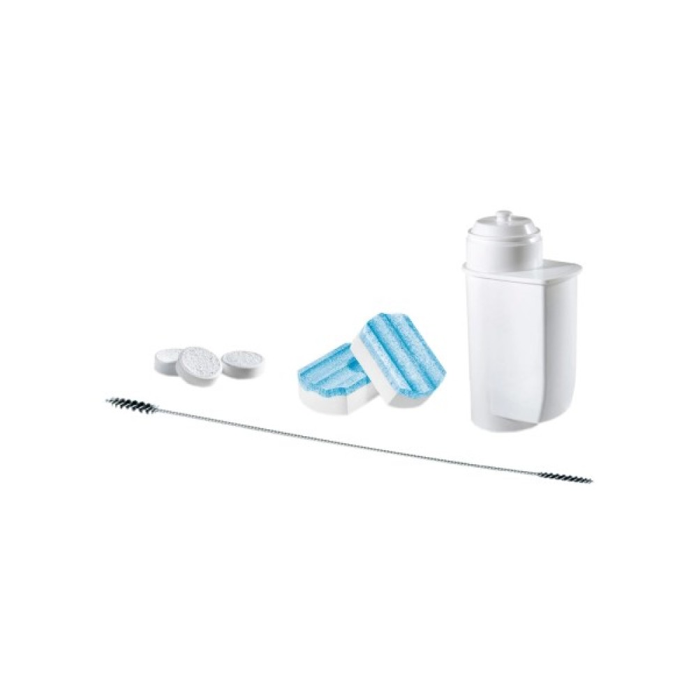 - Вміст набору для догляду: 10 таблеток для очищення від кавового жиру, 3 таблетки для видалення накипу, 1 фільтр для води BRITA Intenza, 1 спеціальна щітка для очищення трубки для молока