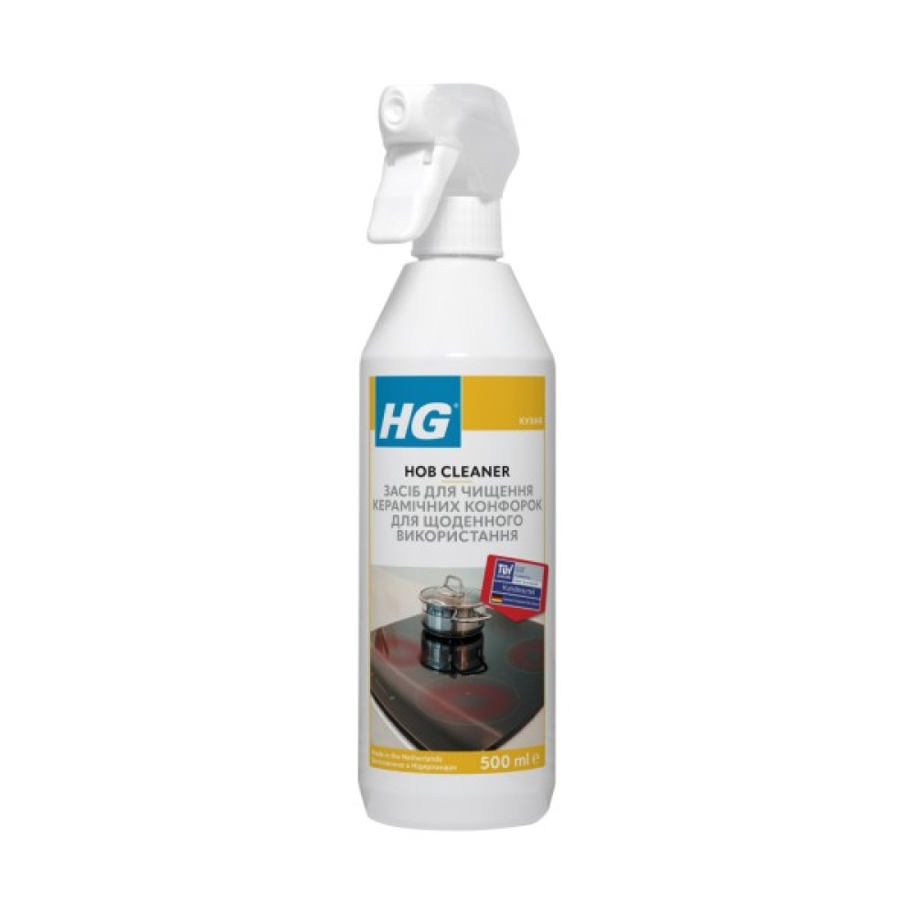 Засіб для очищення керамічних конфорок щоденного використання HG легко та ефективно видаляє жир, бруд, пил, масляні розводи та сліди, різні плями та патьоки з плитки та конфорок.