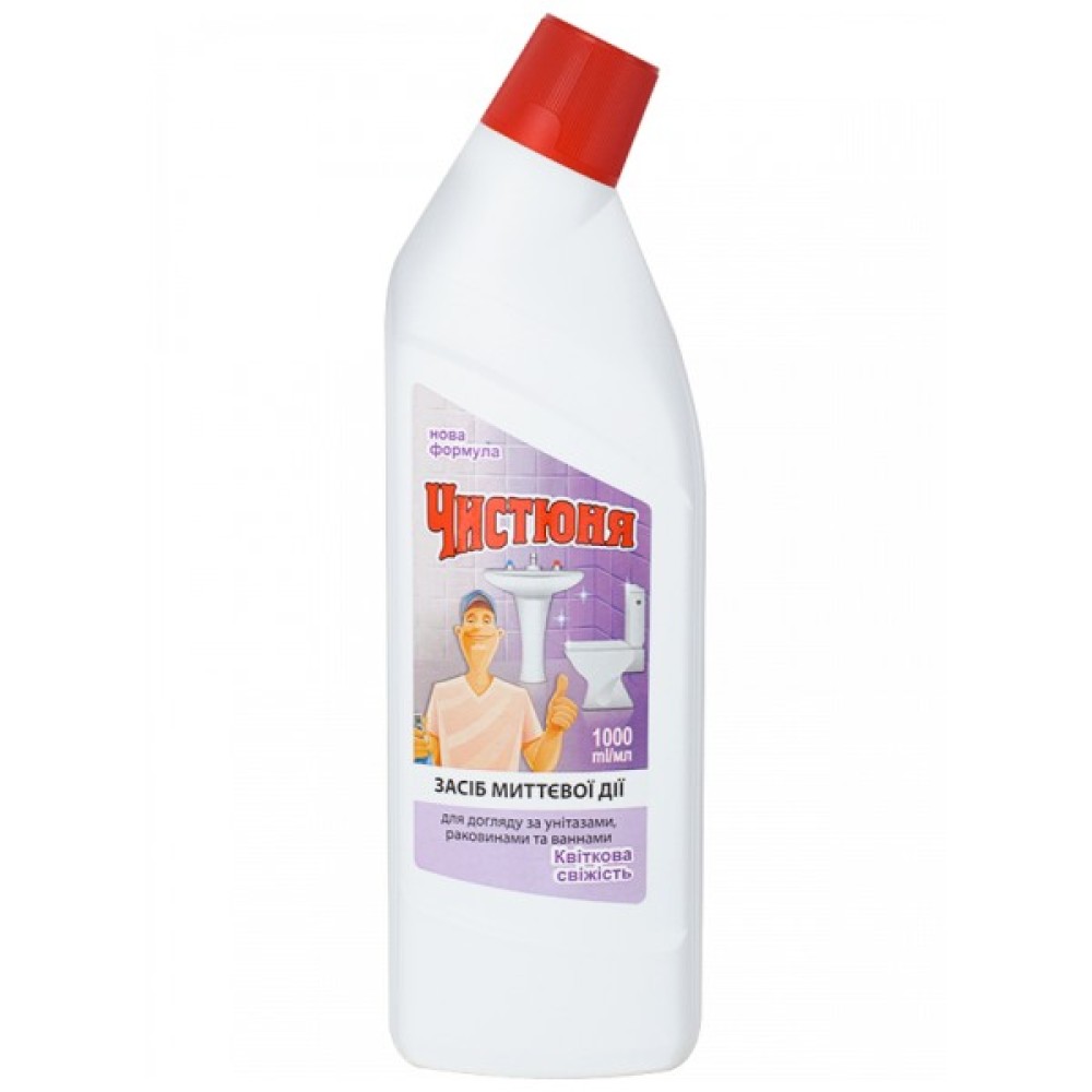 «Чистюня» миттєво видаляє вапняний наліт, іржу, ефективно чистить ванни, мийки, унітази та кахельні поверхні. Засіб містить кислоту!