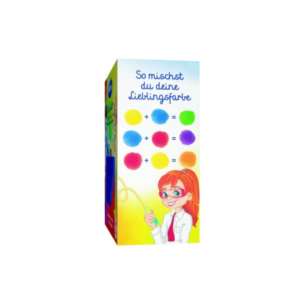 Дитина, купаючись і граючи з Бенні (синій флакончик), Розалі (червоний флакончик) та Гретою (жовтий флакончик), опановує вчення про колір.