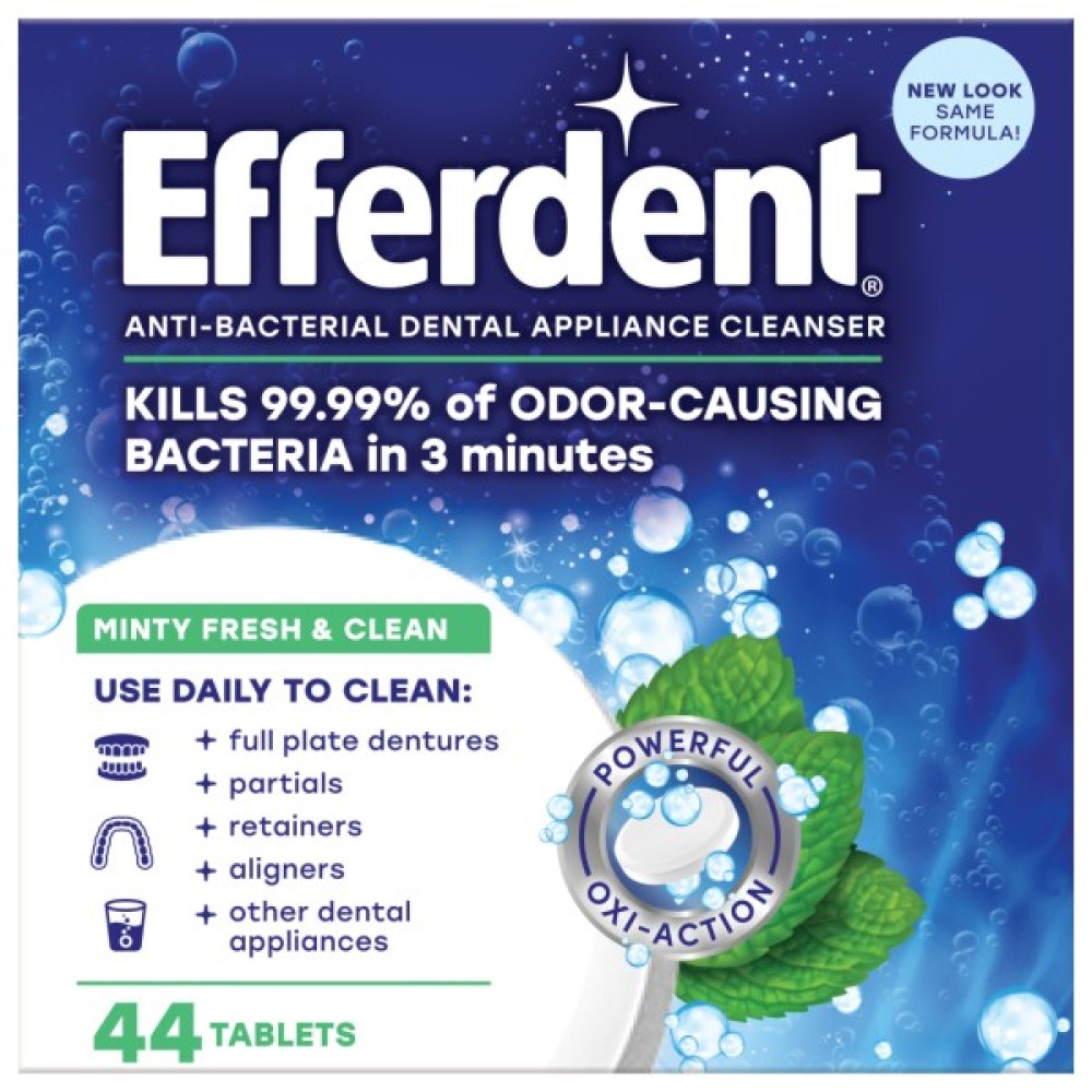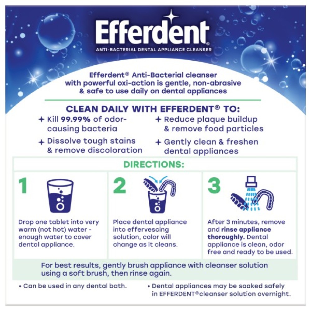 Efferdent М'ята свіжість та очищення Антибактеріальні таблетки борються з утворенням зубного нальоту та знищують бактерії, що викликають неприємний запах. Всього 3 хвилини, і Ваш пластиковий ретейнер чи інші стоматологічні конструкції стануть повністю чистими, свіжими та готовими до використання.