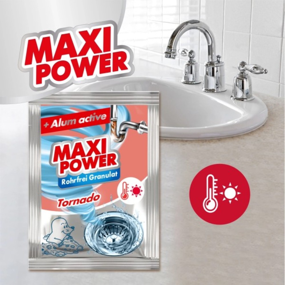 Засіб для чищення труб Maxi Power з теплою водою, гранульоване застосовується для одноразового очищення найсильніших засмічень, моментально позбавляється не тільки скупчення бруду, але і застарілих нашарувань на внутрішній поверхні труб.