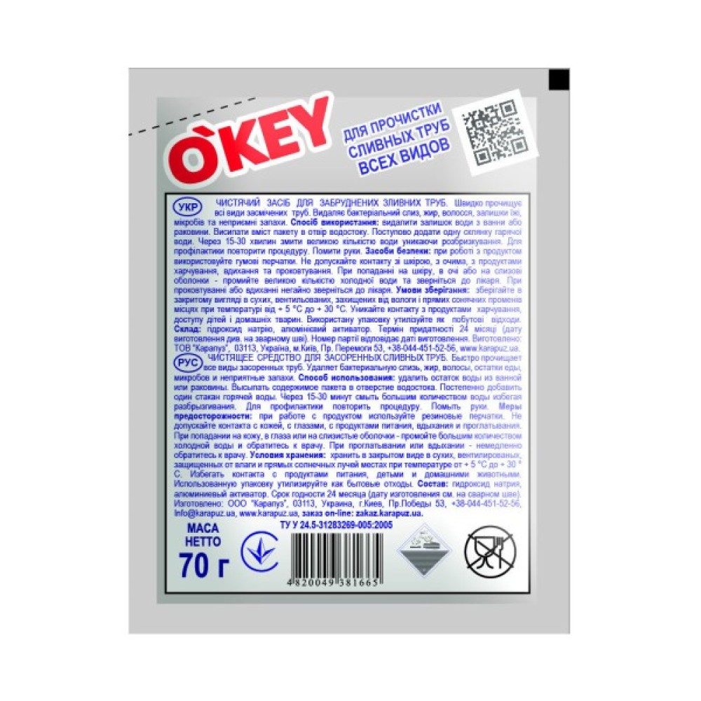 Засіб O'key для розчинення забруднень у каналізаційних трубах.