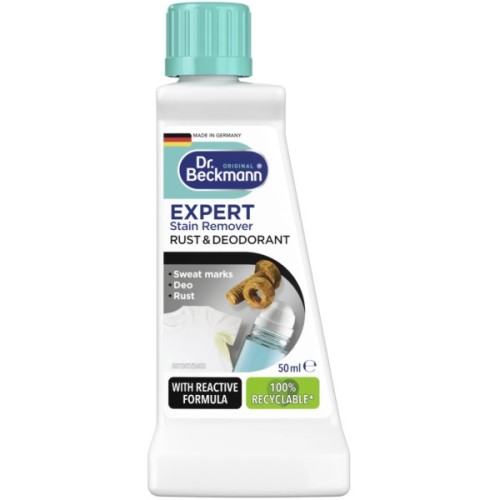 При пранні текстильного виробу, як зазвичай при контакті з водою залізо окислюється і починає іржавіти. Dr. Beckmann видаляє плями іржі або дезодоранту за допомогою спеціально розробленої відновлюючої формули, яка нейтралізує окислення і, тим самим, забезпечує видалення плями.