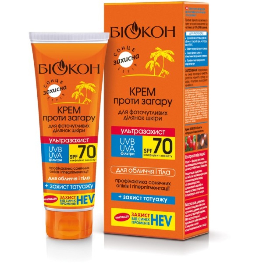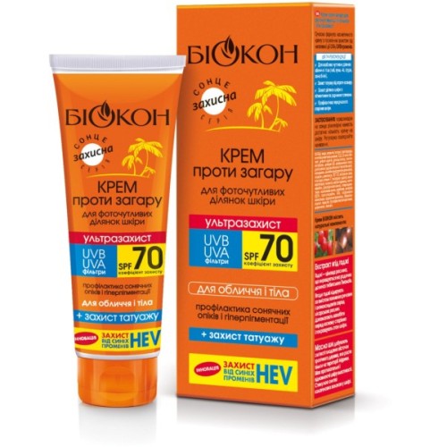 Крем проти засмаги Біокон Ультразахист створений спеціально для захисту особливо чутливих ділянок шкіри обличчя й тіла найбільш чутливих до негативної дії сонячних променів. Сучасна формула з посиленим захистом від негативної дії UVA-/UVB-променів.
