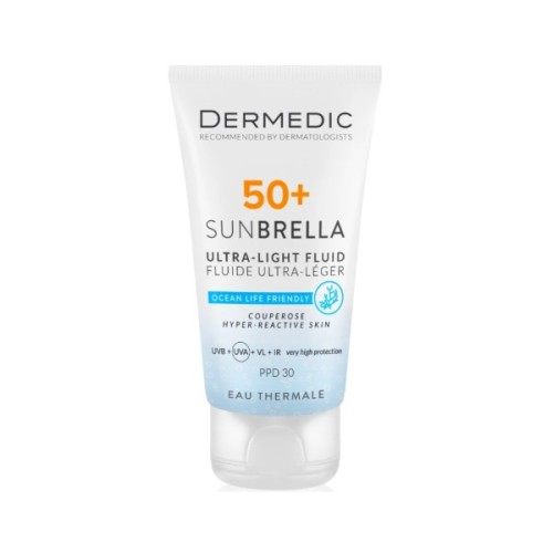 Ультралегкий флюїд SPF 50+ поєднує ніжну текстуру на водній основі з високим рівнем захисту чутливої шкіри з куперозом від усього спектру сонячних променів.