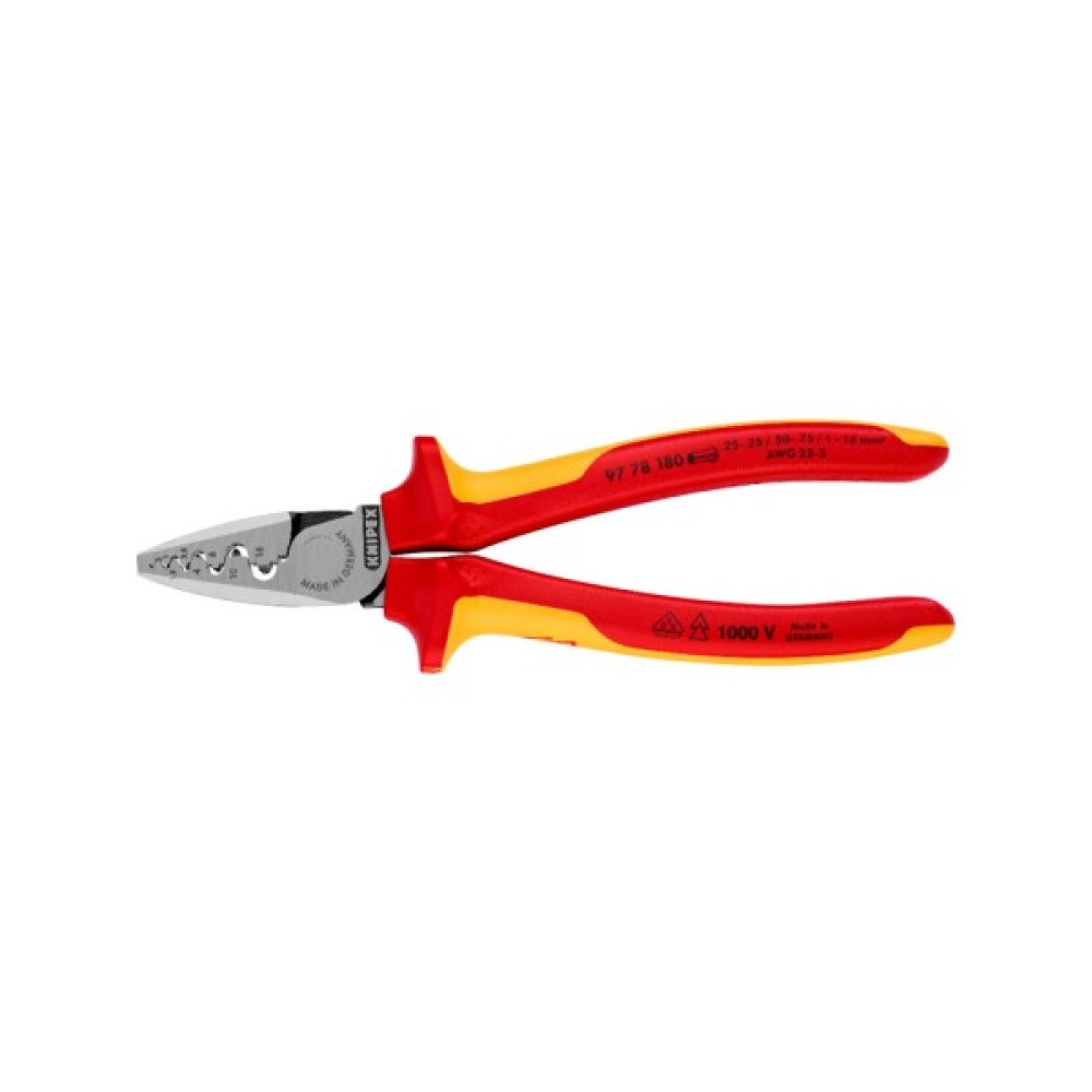 Кліщі для обтиску 97 78 180 від Knipex є надійним і точним інструментом, який можна використовувати там, де обжимають кінцеві втулки (наконечники) з профілем ялини: наприклад, коли роботи з переобладнання проводяться в ІТ у серверній, під час обтиску кінцевих втулок у шафи керування або побутові електричні системи, наприклад під час встановлення освітлювальних елементів. Ці обтискні кліщі ізольовані багатокомпонентними ручками та перевірені VDE відповідно до стандарту ізоляції IEC 60900 / DIN EN 60900.