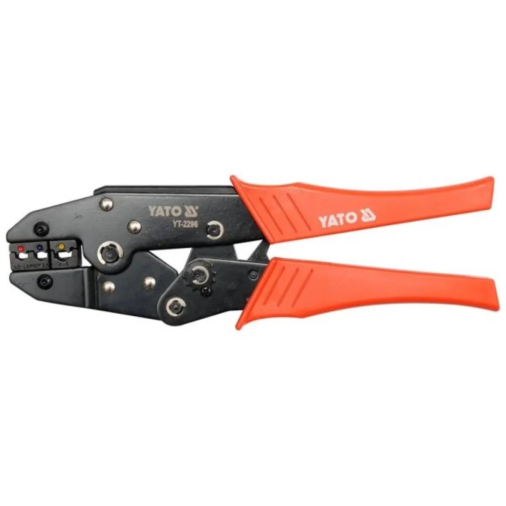Кліщі YT-2296 для обтиску ізольованих роз'ємів, з вороненою поверхнею, що захищає від корозії, та пластиковими накладками рукоятки. Храповий механізм забезпечує швидкий і точний затискач без застосування надмірної сили.