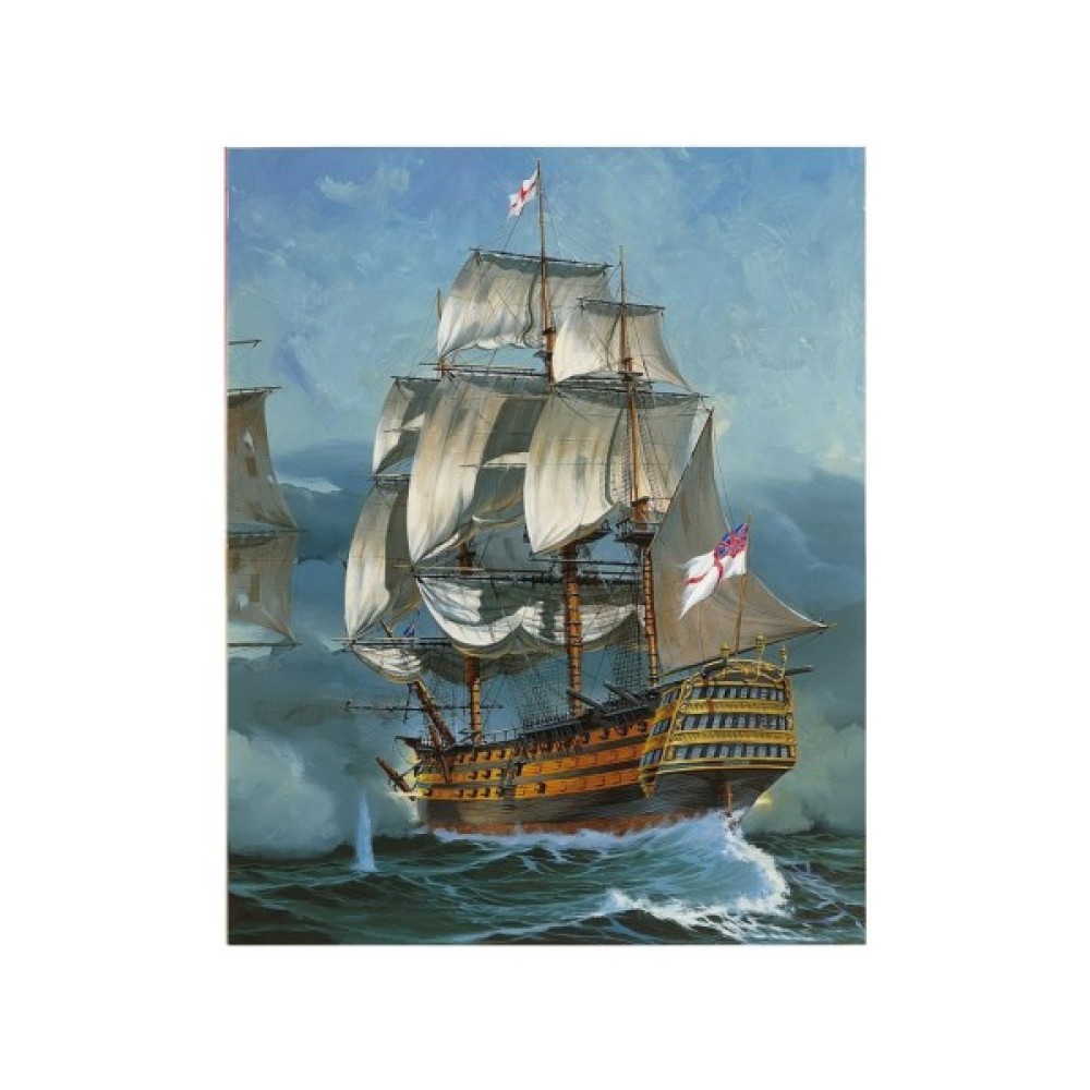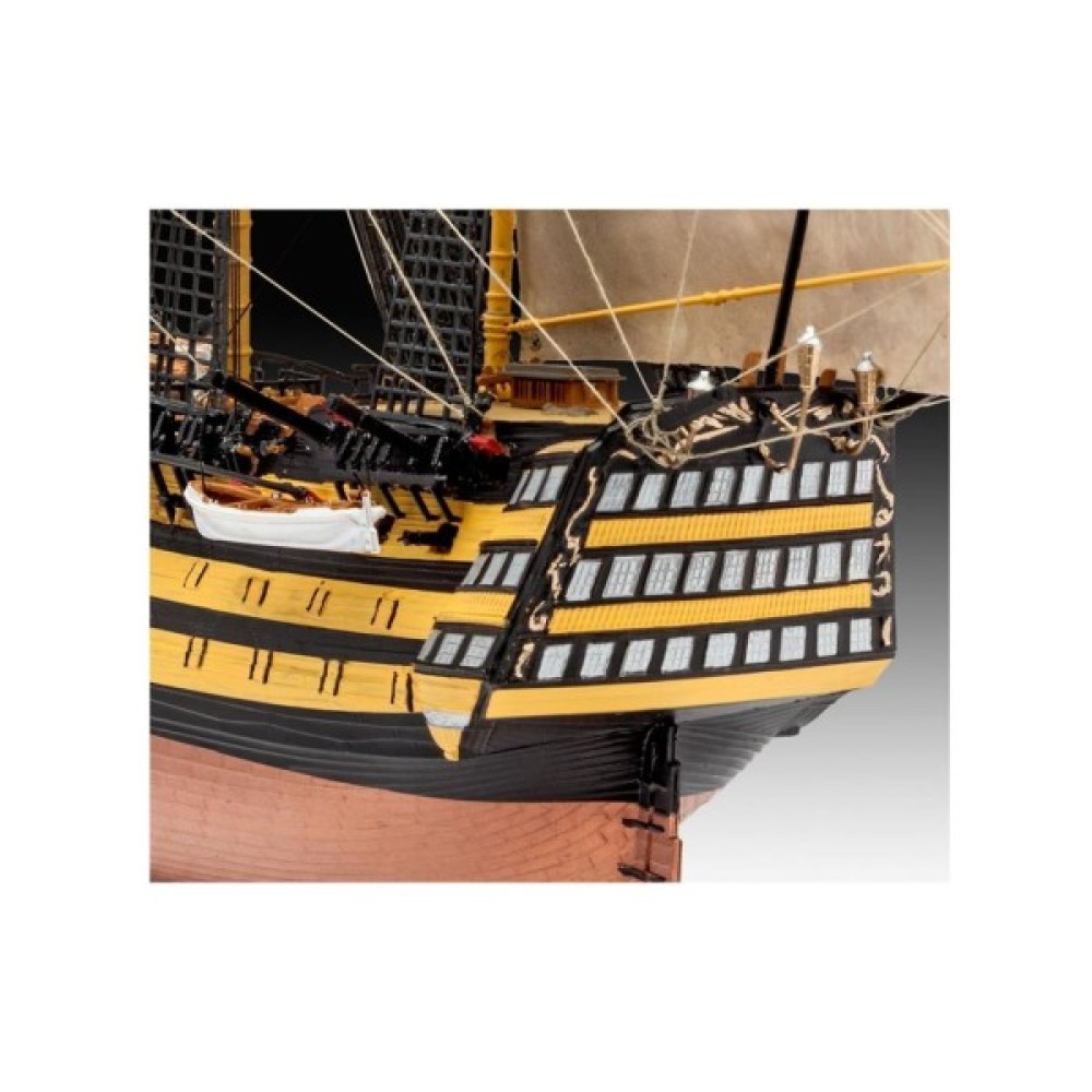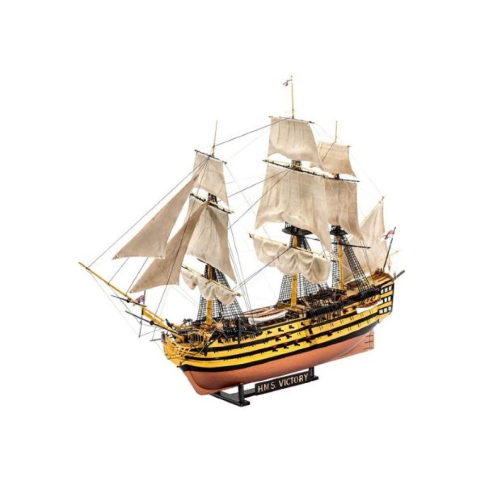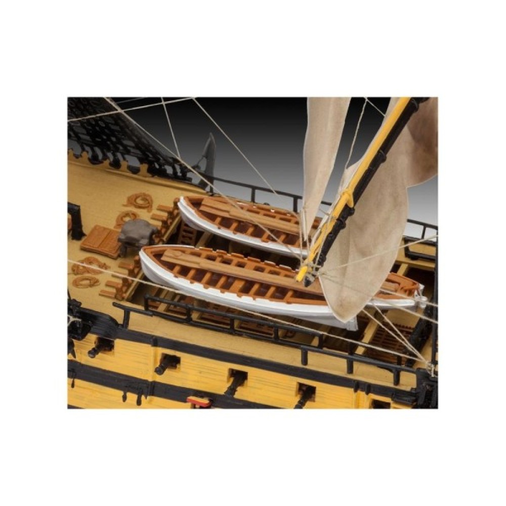 "Перемога" стала флагманом адмірала лорда Нельсона в битві при Трафальгарі в 1805 році. Маючи цей корабель на чолі свого флоту, він досяг вражаючої перемоги над наполеонівськими кораблями, але був смертельно поранений. "Перемога" збереглася до наших днів і пришвартована в Портсмуті, Англія. - структурований корпус з двох частин; - палуба з імітацією під дерево; - деталізовані палубні будови; - гармати на кріпленнях; - деталізовані щогли; - автентичні вітрила; - такелажна нитка в комплекті; - рятувальні човни; - такелаж; - вітринна підставка; - чотири якоря; - прапор; - автентичні декалі.