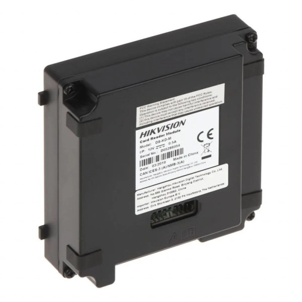 HikVision DS-KD-M – модуль простого розширення панелі виклику складної конструкції з картридером на борту. Інтерфейс: з'єднання модулів (1 вх та 1 вих), DIP перемикач (8, 4 зарезервовано). Монтаж проводиться як накладним, так і врізним методом. Клас герметичності IP65. Живлення від 12 Вольт. Потужність споживання на рівні 10 Ватт.