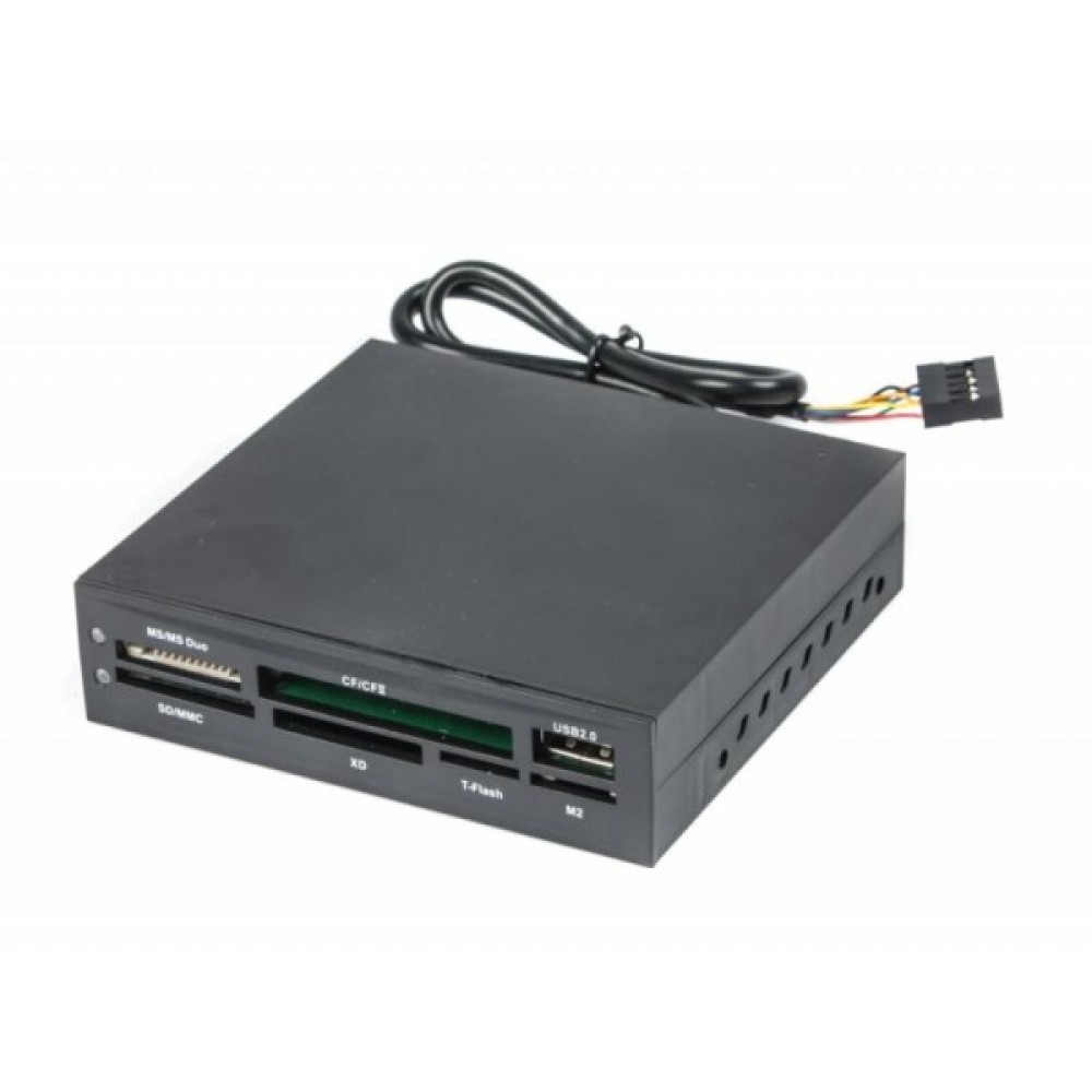 Зчитувач флеш-карт GEMBIRD FDI2-ALLIN1-02-B - це зручний адаптер для підключення до комп'ютера пристроїв з інтерфейсом USB, SATA і карт пам'яті різних типів. Закріплюється на 3.5-дюймовому відсіку системного блоку за допомогою вхідних в комплект поставки гвинтів, підключається до USB-роз'єму на материнській платі вбудованим кабелем. Порт USB 2.0 і слоти для карт пам'яті розташовані на передній панелі адаптера. Слоти оснащені світлодіодною індикацією статусу підключених носіїв.