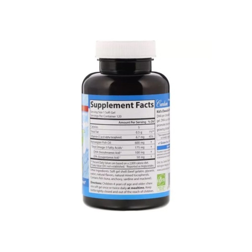 DHA для дітей від Carlson має приємний апельсиновий смак. DHA - це складова омеги-3, яка міститься в риб'ячому жирі. До народження та під час дитинства DHA грає важливу роль в здоровому розвитку всієї нервової системи, включаючи мозок. Ця важлива речовина надається нам в утробі матері, а потім з грудного молока. По мірі розвитку і дозрівання ми отримуємо DHA з нашого раціону або добавок, тому що вона продовжує відігравати важливу роль у здоров'ї мозку та зору. На жаль в повсякденному раціоні багатих на цю важливу речовину продуктів вкрай мало, тому необхідно поповнювати свої запаси шляхом прийому біодобавок.