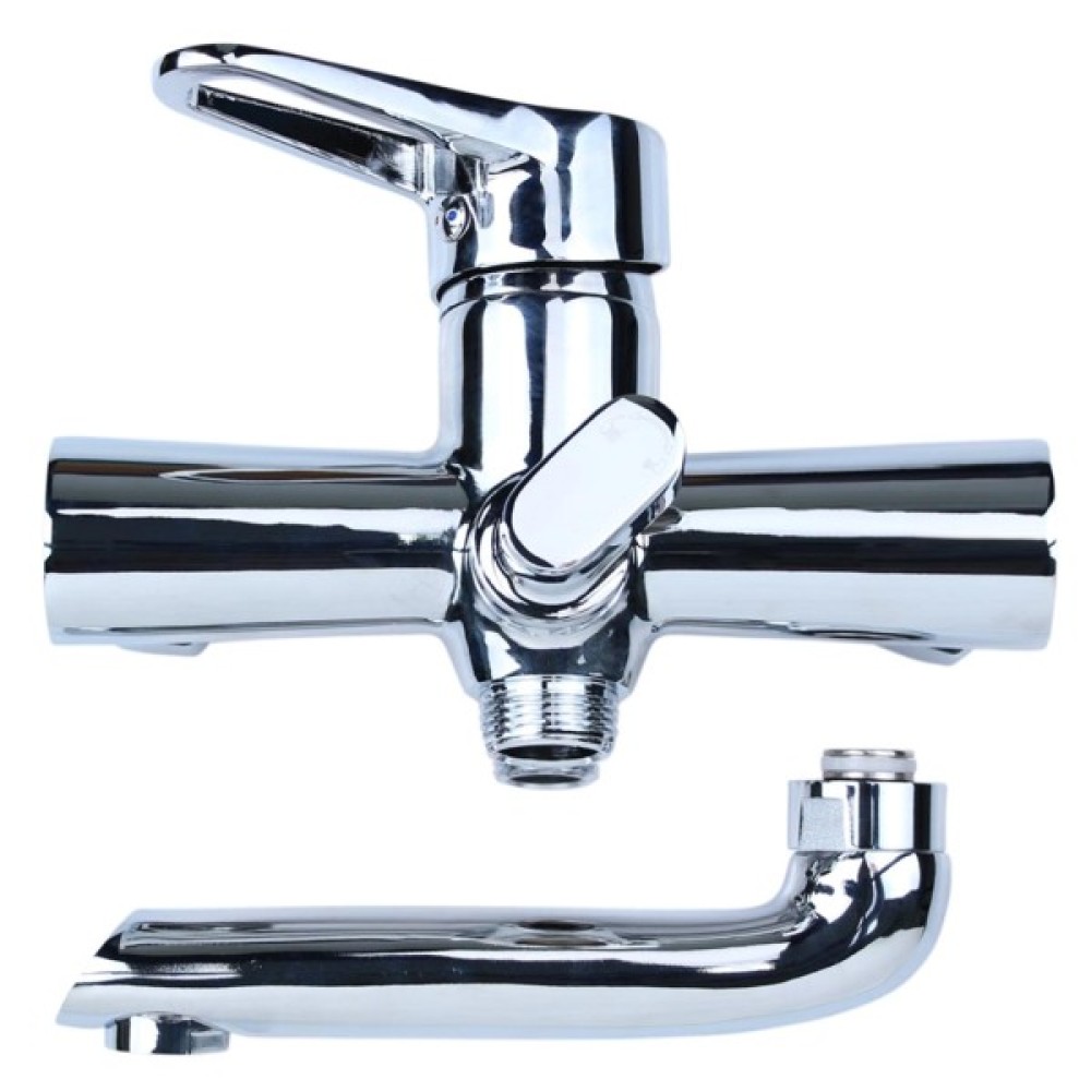 Одноважільний, настінний змішувач для ванни HK-2C130C в хромованому кольорі від Aquatica, має поворотний вилив з виносом 13.3 см, обладнується переднім перемикачем ванна/душ, нижнім відведенням для під'єднання душового шланга під діаметр 1/2", і встановлюється на два отвори за допомогою ексцентрикового з'єднання під діаметр 1/2".