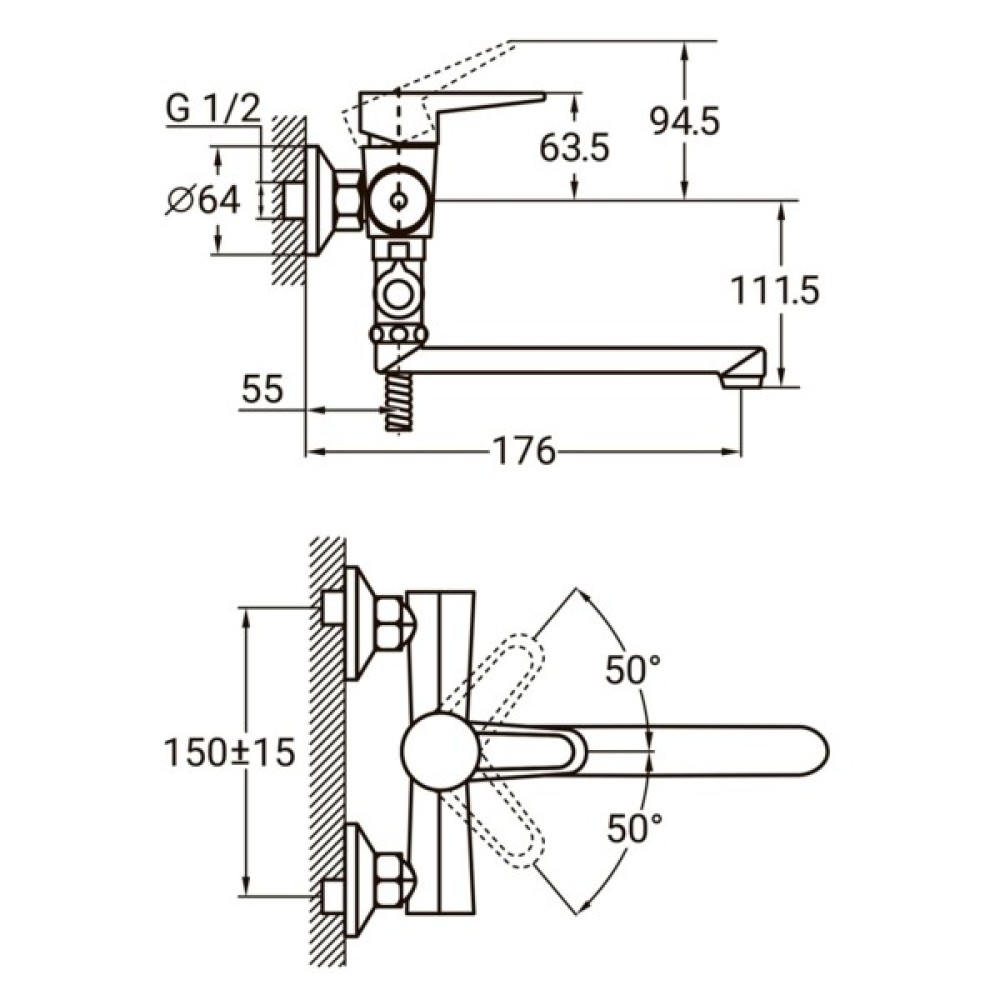 Додаткові характеристики керамічний картридж 35 мм; тип кріплення: ексцентрики під діаметр 1/2"; настінний тримач для ручної лійки з ABS-пластику; шланг для душу у металевому обплетенні завдовжки 150 см; бічне відведення для під'єднання душового шланга під діаметр 1/2" інтегрований з тримачем для ручної лійки; однорежимна, кругла ручна лійка; бічний (на стійці виливу) перемикач ванна/душ