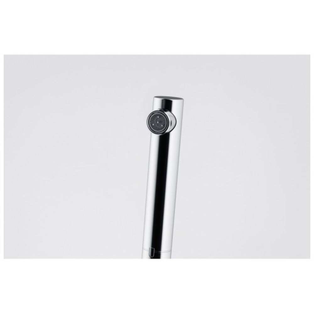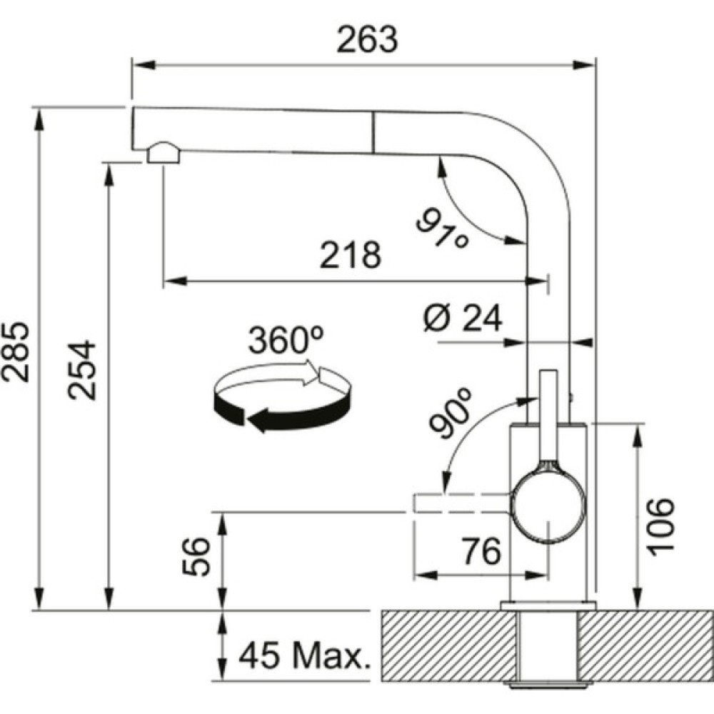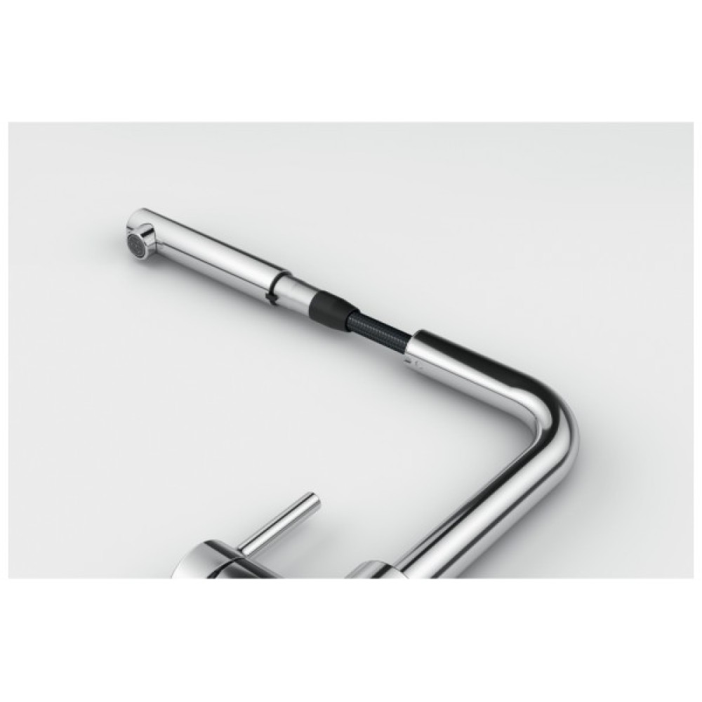Кухонний змішувач з поворотним витяжним виливом і бічним важелем керування. Витяжний вилив дозволяє зручно мити всю поверхню мийки та наповнювати посуд, який розміщений поза її межами. Кут повороту виливу складає, 360° тому водяний потік досягає більшої площі мийки.