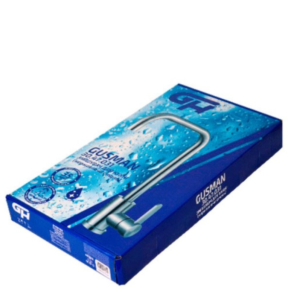 Змішувач для кухні 30.47.031 GUSMAN GH, виготовлений з нержавіючої сталі із сатиновим покриттям. Не втрачає своєї зовнішньої привабливості навіть через довгий період експлуатації, крім цього матеріалу притаманні такі характеристики як стійкість до корозії і механічна стійкість. Має дноважільне управління напором і температурою води. Сучасний і стриманий дизайн чудово підійде під будь-який інтер'єр. Має поворотний вилив з виносом у 21.6 см зручний для використання на кухні, а висота дозволяє наповнювати високі ємності. У комплекті гнучкий шланг підведення води з гайкою 1/2 "
