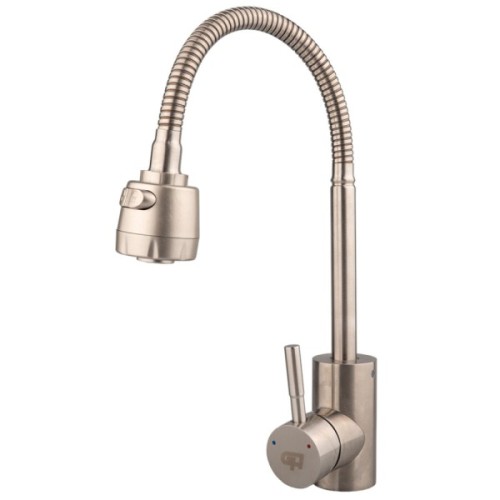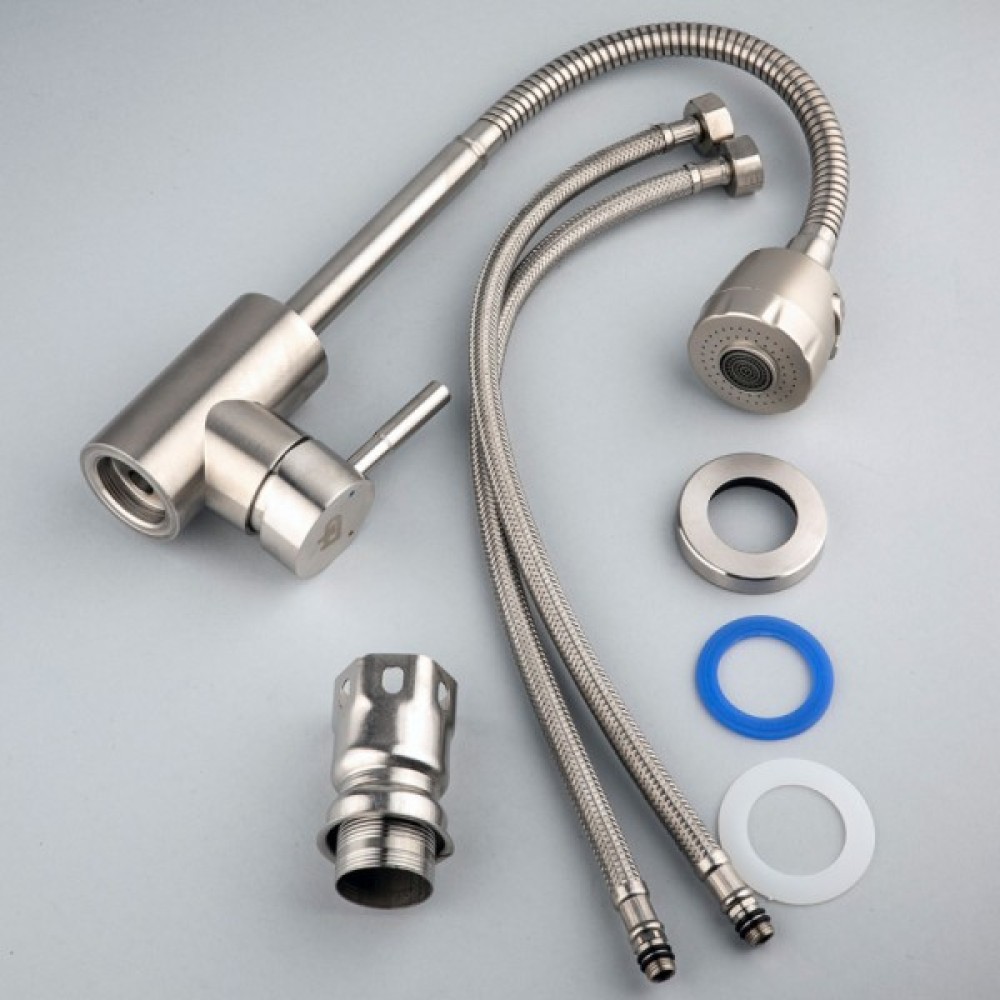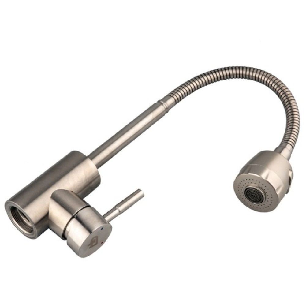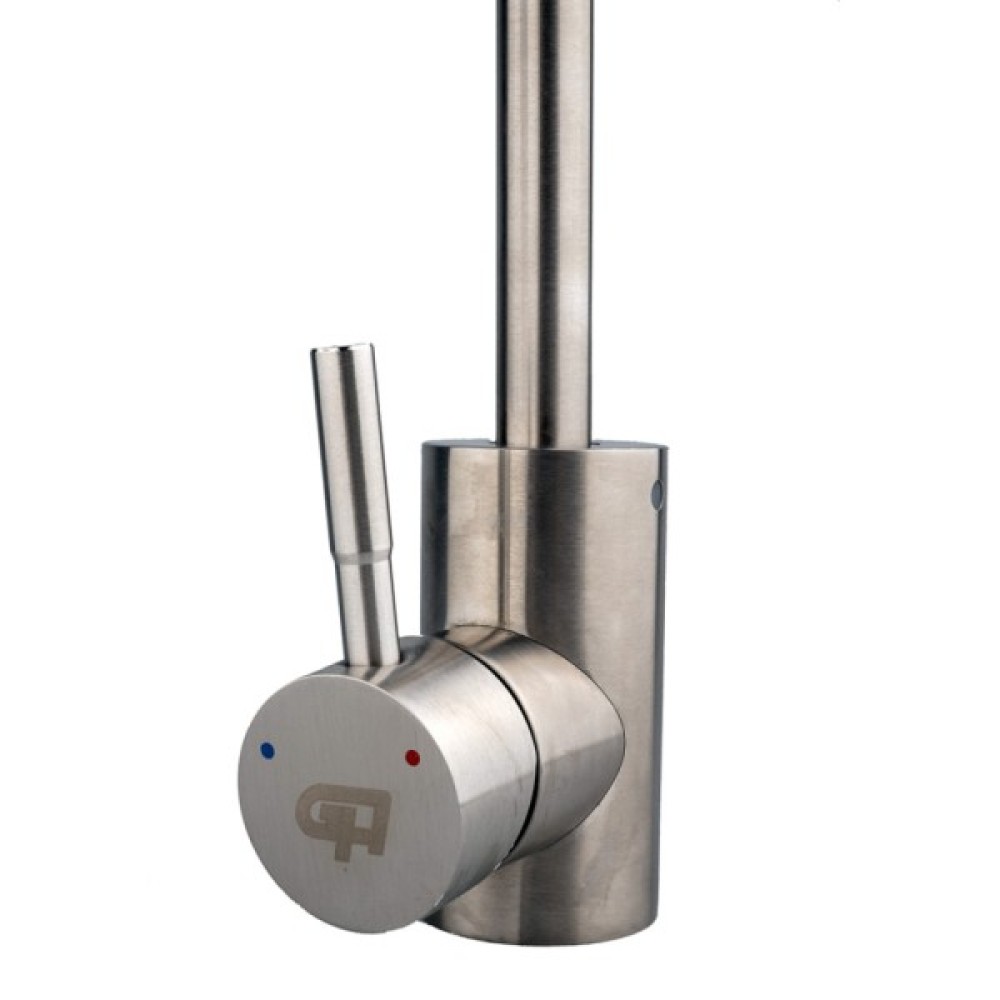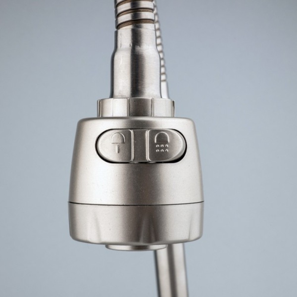 Опис Змішувач для кухні з гнучким зливом GH Piano Змішувач для кухні з гнучким зливом GH - із серії Piano, виготовлений з нержавіючої сталі, яка не втрачає своєї зовнішньої привабливості навіть через довгий період експлуатації, крім цього матеріалу притаманні такі характеристики як стійкість до корозії і механічна стійкість. Має Одноважільний управління напором і температурою води. Як механізм змішування встановлений картридж 35 мм, що відрізняється безшумною роботою і надійністю. Виконано в кольорі нікель, сучасний і стриманий дизайн чудово підійде під будь-який інтер'єр. Обладнаний аератором з двома режимами роботи. Завдяки цьому можна швидко набрати ємність води або помити овочі. При включенні душа різко збільшується омивається площа поверхні, що дає можливість економити воду. А рефлекторний гусак дозволяє опускати і піднімати прилад на різну висоту. У комплекті гнучка підводка з гайкою 1/2 "дюйма, 40 см.