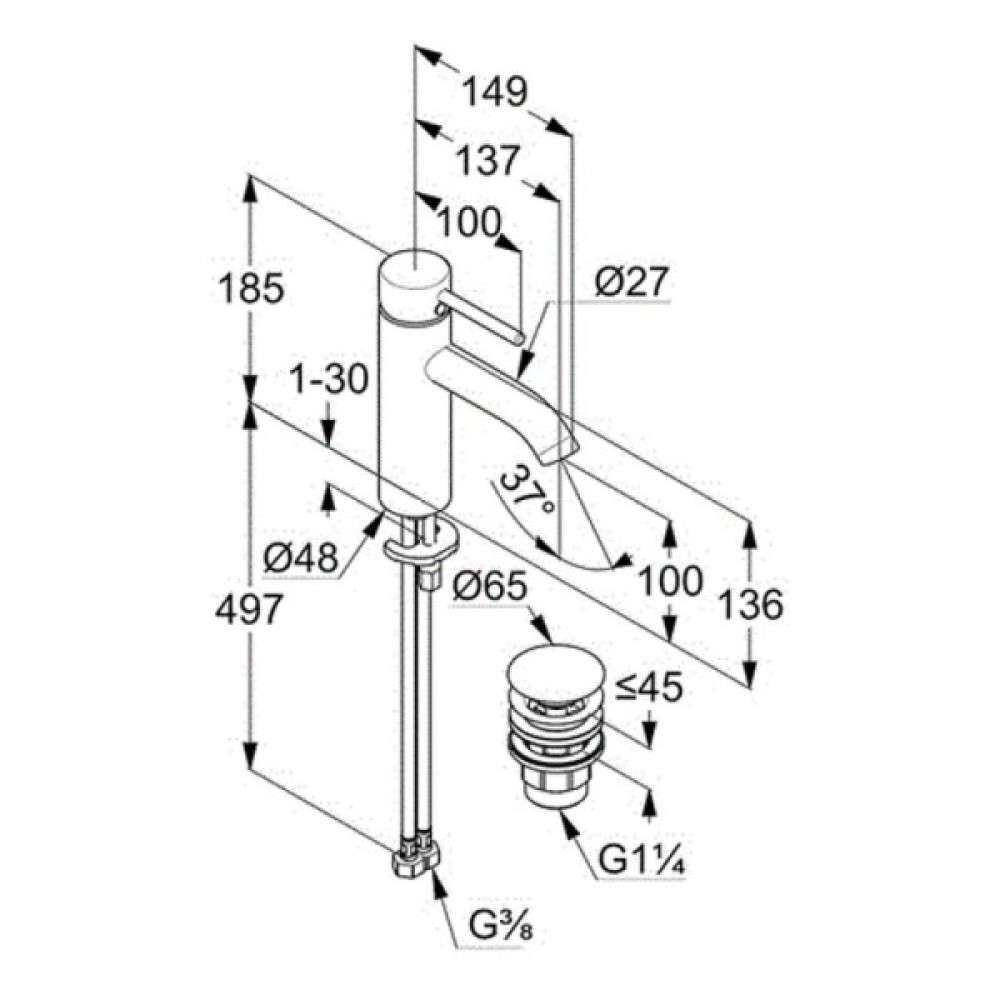 Додаткові характеристики донный клапан; аератор; гнучке підведення 3/8"; система швидкого монтажу; керамічний картридж з обмежником гарячої води