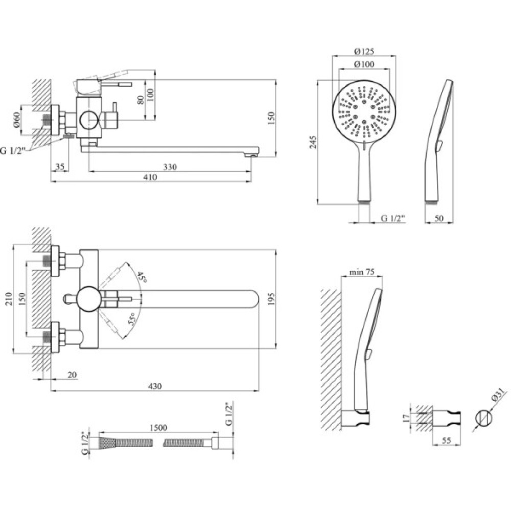 Комплект поставки змішувач; душовий шланг; кріплення; тримач для душу; інструкція; лійка для ручного душу