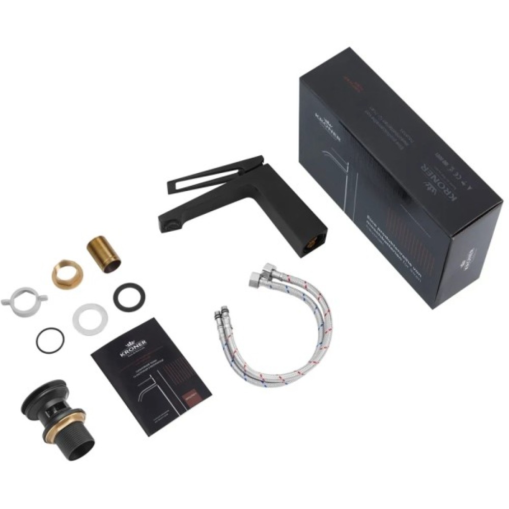 Комплект поставки змішувач; шланги підведення води; донний клапан; кріплення; інструкція