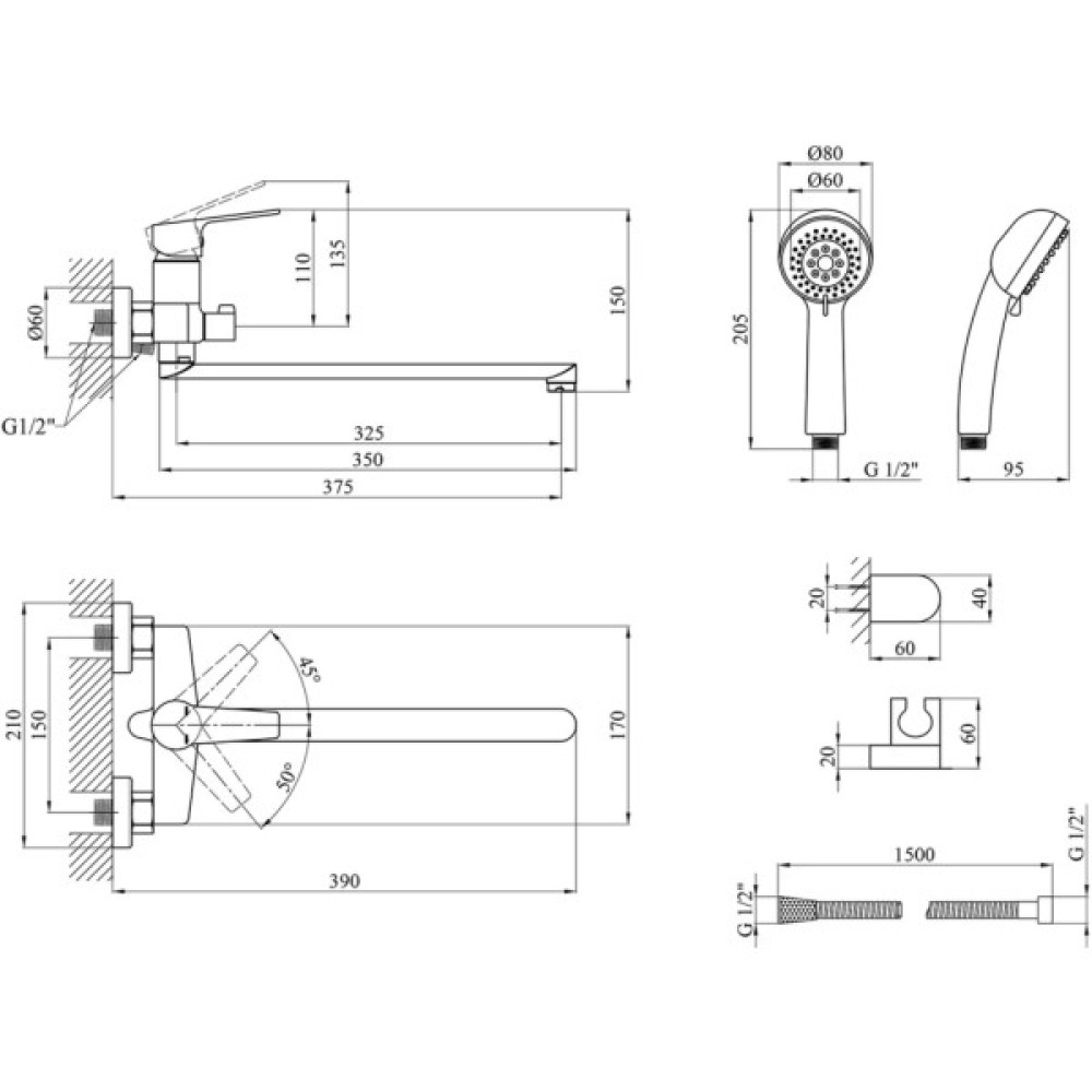 змішувач; душовий шланг; кріплення; інструкція; лійка для ручного душу