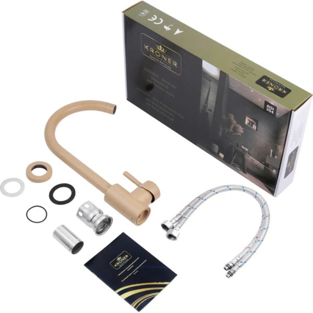 Змішувач для кухні Kroner KRP Edelstahl Klassisch - COL035 - ідеальний вибір для вашої кухні. Виготовлений з нержавіючої сталі, він гарантує міцність та довговічність. Має привабливий матовий бежевий колір, що додає йому елегантності. Змішувач оснащений картриджним механізмом змішування, що дозволяє зручно регулювати температуру води. Його унікальна U-подібна форма виливу забезпечує зручність під час наповнення посуду або миття продуктів. Насолоджуйтесь функціональністю і стилем змішувача Kroner.