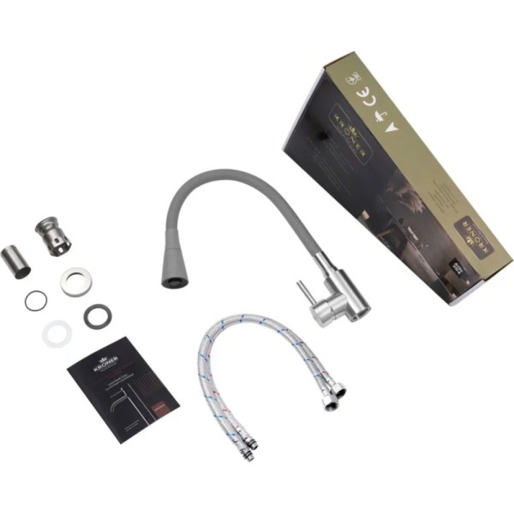 Kroner ESG031GRA - ідеальний варіант для тих, хто віддає перевагу стриманим і світлим тонам в інтер'єрі кухні. Змішувач виконаний в єдиній колірній гамі: сталевий корпус та сірий силіконовий вилив створюють лаконічний образ, який легко впишеться в сучасний або мінімалістичний інтер'єр.