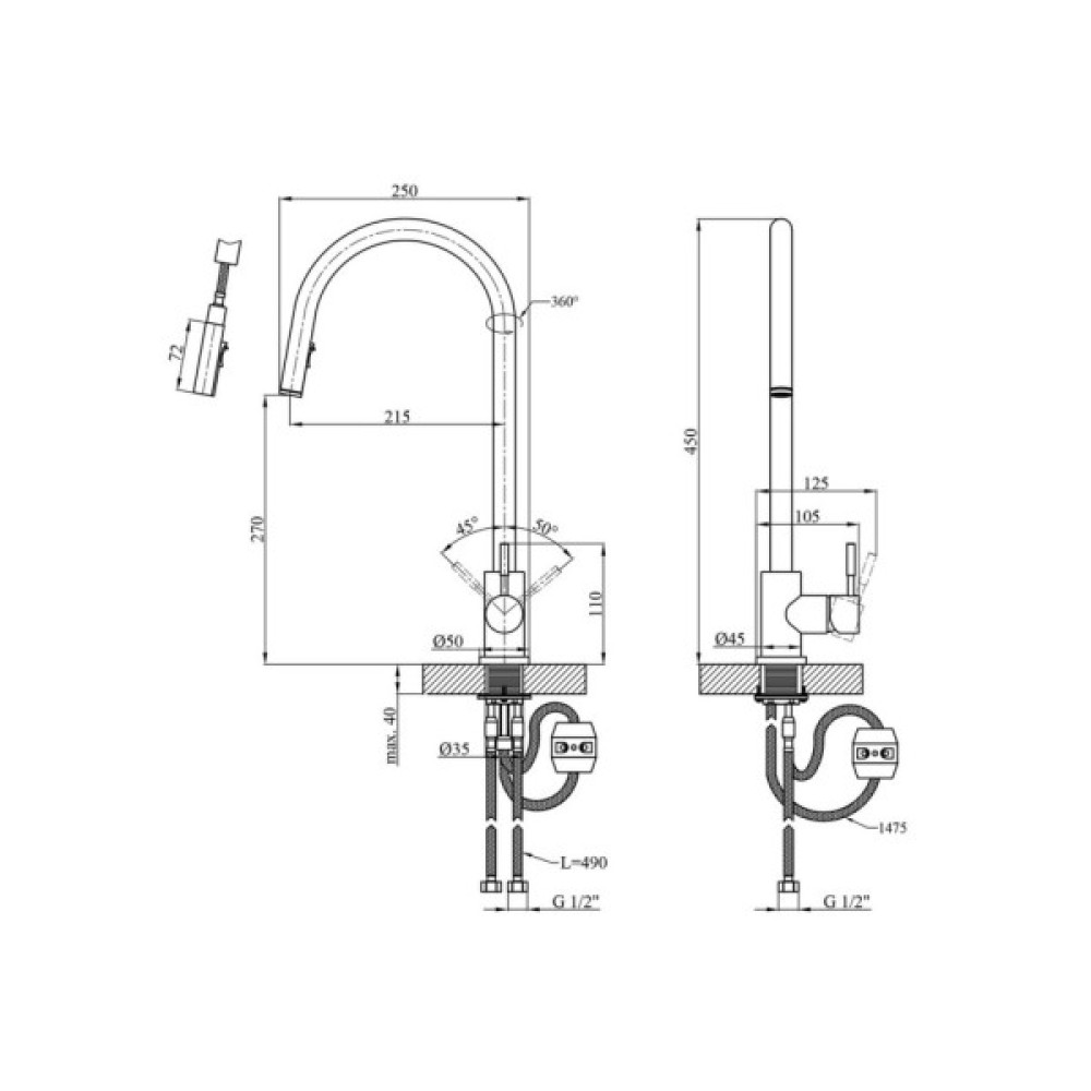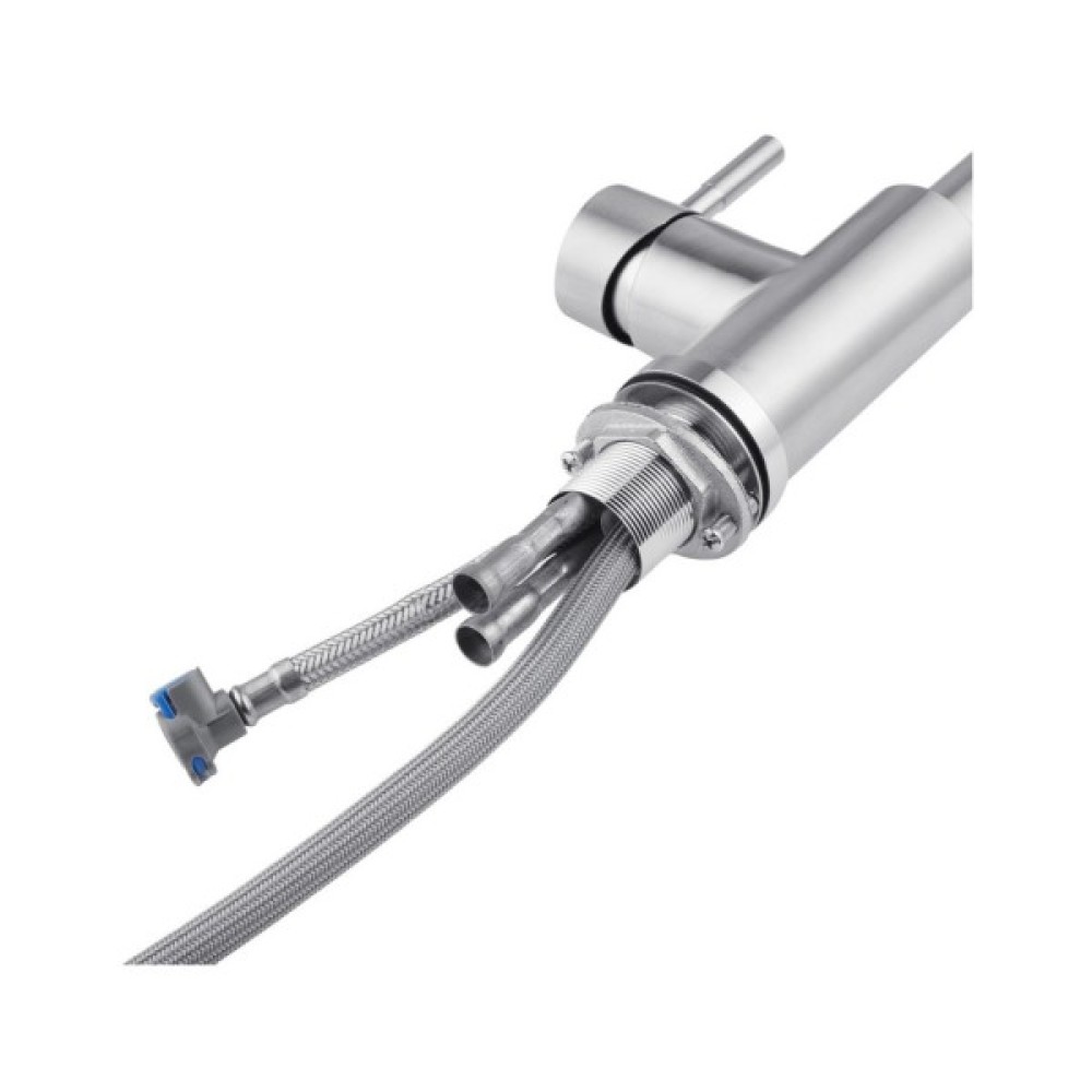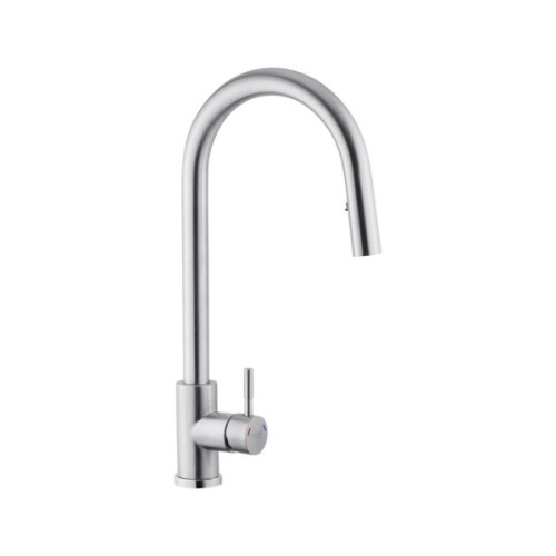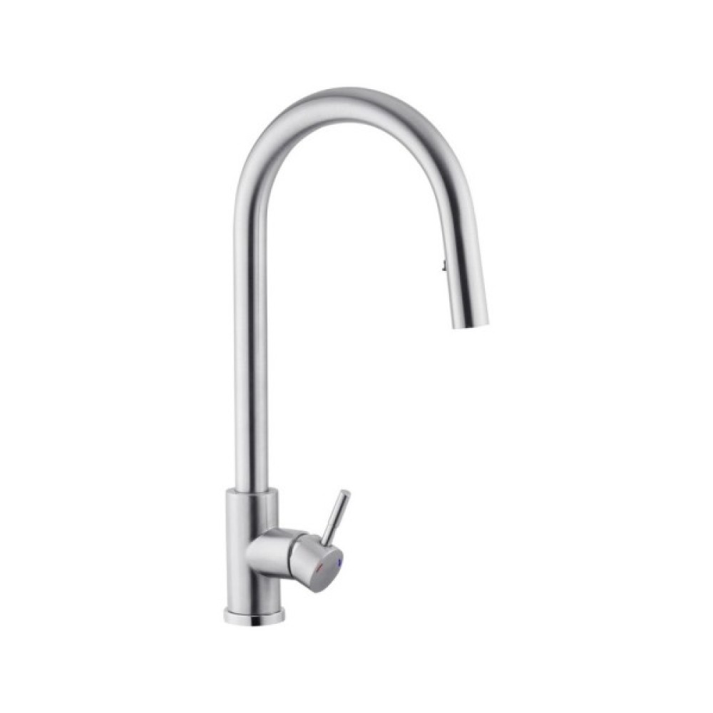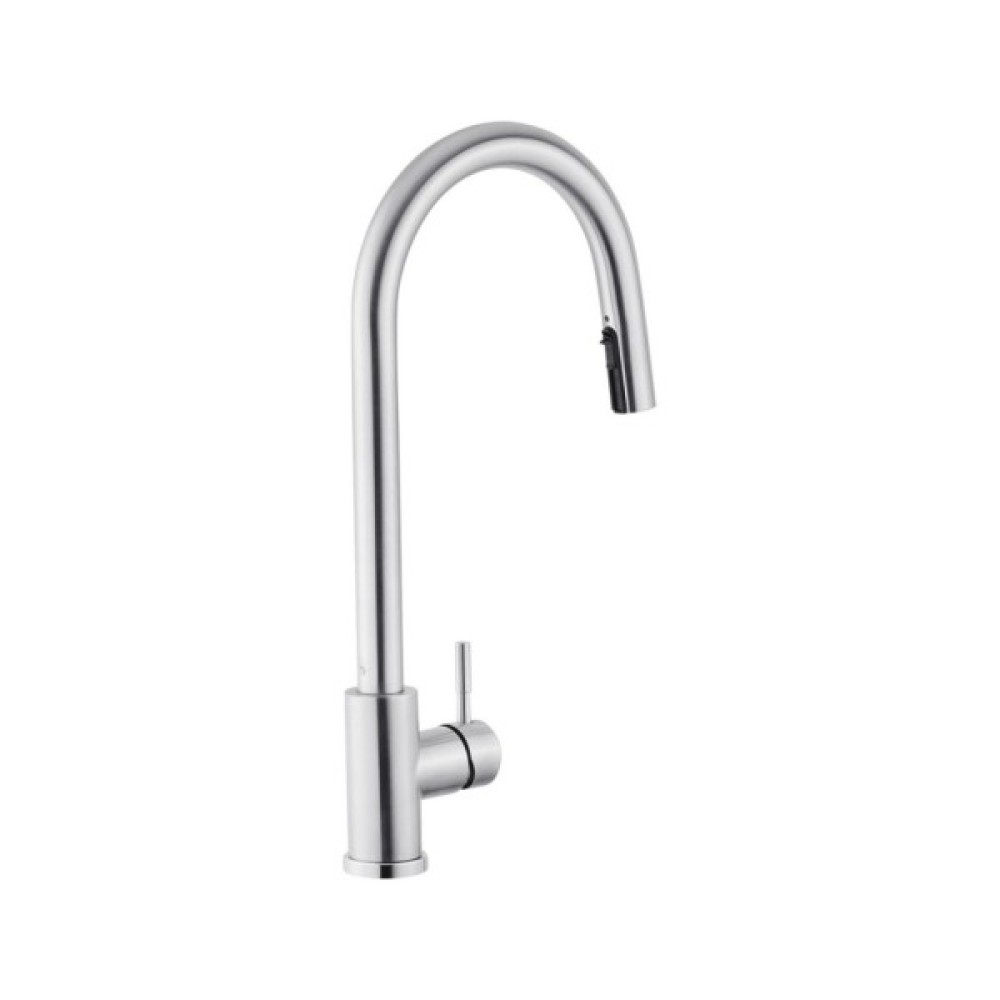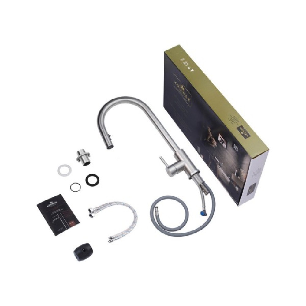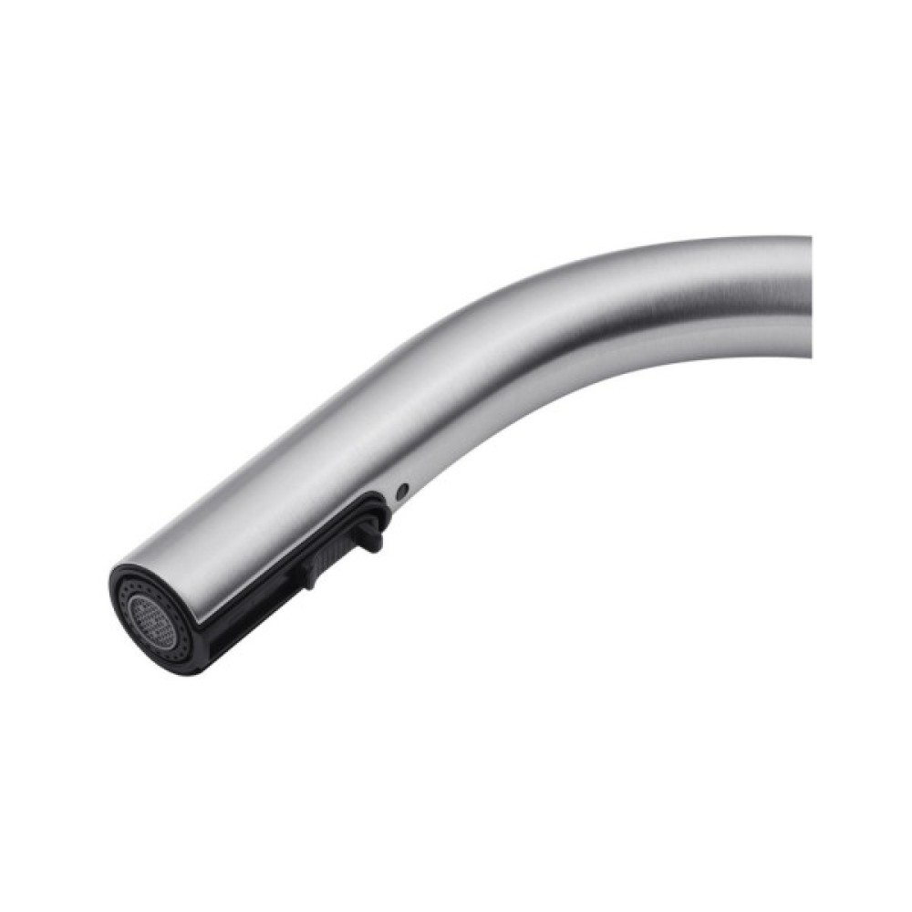 Змішувач для кухні Kroner KRP Edelstahl Klassisch - ESG03915 – це вишуканий виріб з нержавіючої сталі, що поєднує в собі естетику і функціональність. Відмінно підійде для сучасних кухонь. Завдяки одноважільному керуванню і врізному способу монтажу, він легко інтегрується в ваш простір. Брашована поверхня та U-подібна форма виливу надають йому елегантний вигляд. Змішувач оснащений висувним/поворотним виливом, що забезпечує зручність використання. Механізм змішування з картриджем діаметром 35 мм гарантує надійність і довговічність. До комплектації входять гнучка підводка, шланг для висувної лійки, лійка, якір і кріплення, що робить процес установки простим і зручним. Цей змішувач відповідає високим стандартам зручності і стилю на сучасній кухні.