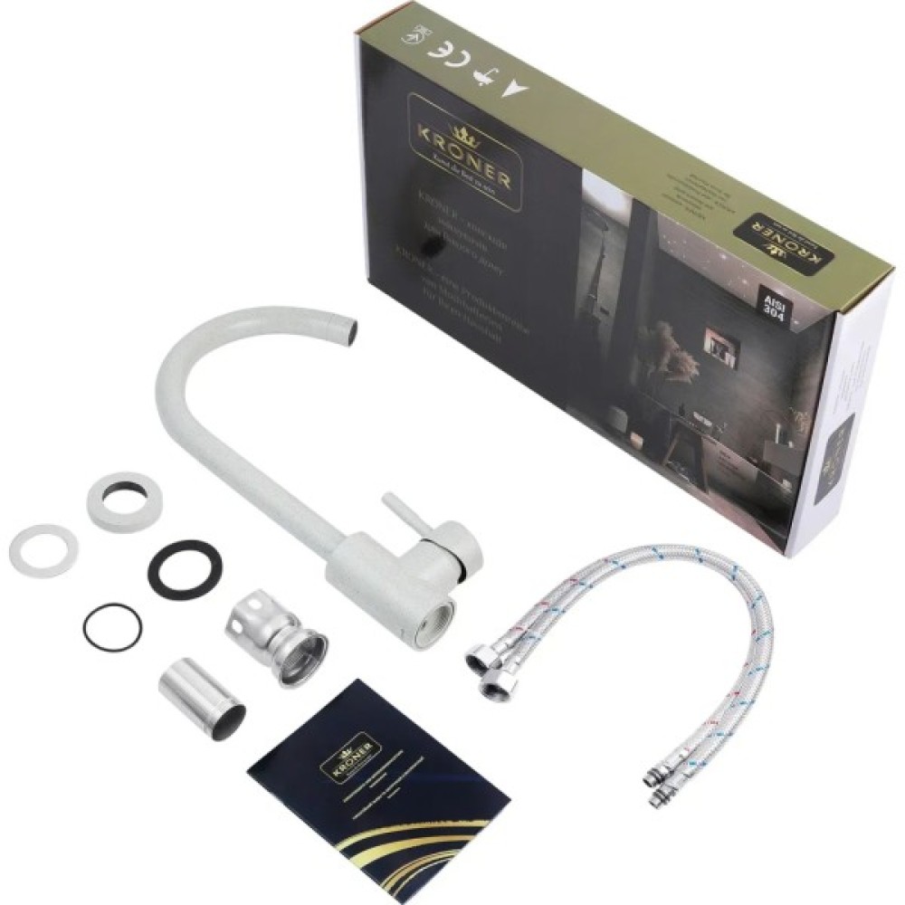 Змішувач для кухні Kroner KRP Edelstahl Klassisch - GRA035 - ідеальний вибір для вашої кухні. Виготовлений із нержавіючої сталі, він гарантує міцність та довговічність. Має привабливий матовий сірий колір, що додає йому елегантності. Змішувач оснащений картриджним механізмом змішування, що дозволяє зручно регулювати температуру води. Його унікальна U-подібна форма виливу забезпечує зручність під час наповнення посуду або миття продуктів. Насолоджуйтесь функціональністю та стилем змішувача Kroner.