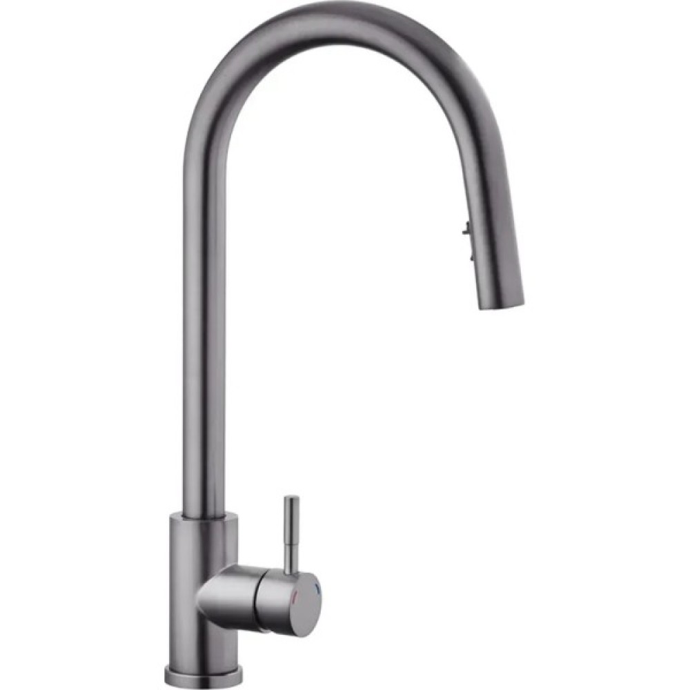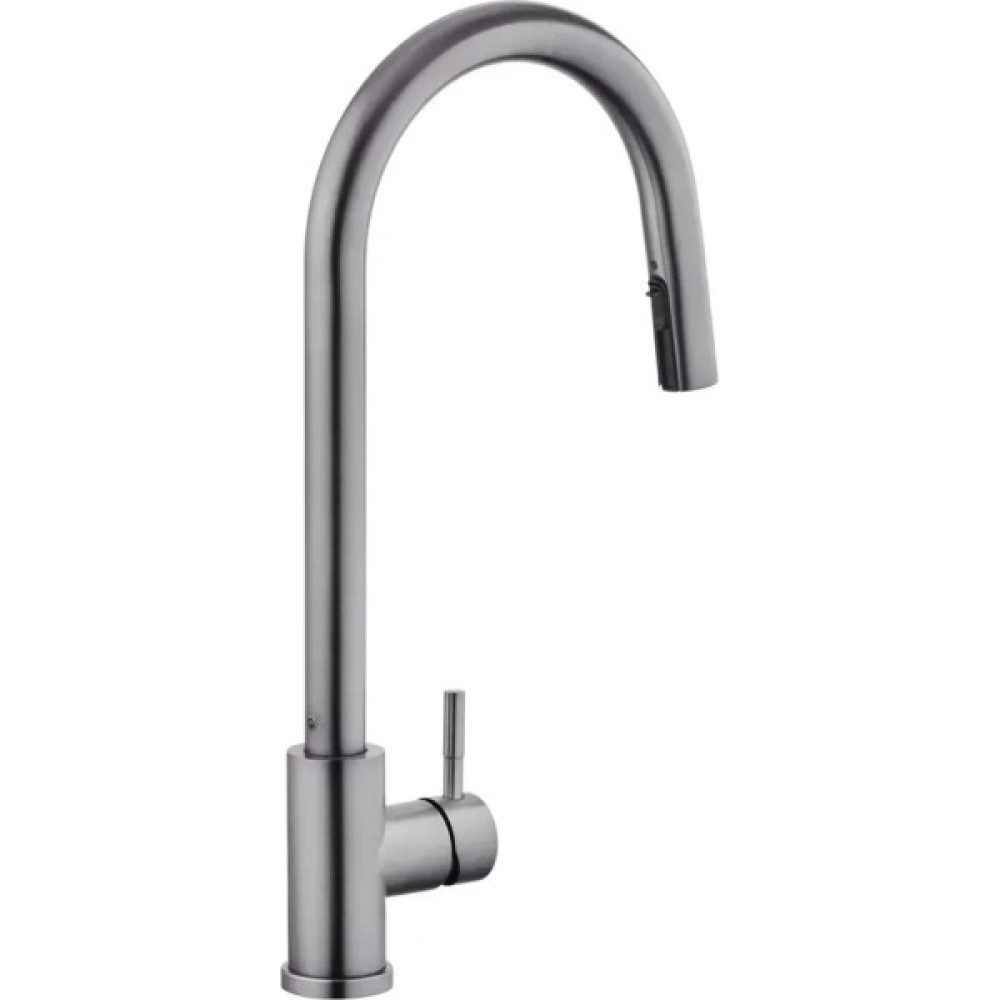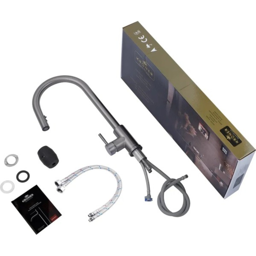 Змішувач для кухні з висувним виливом Kroner KRP Edelstahl Klassisch - PVD03915 - це вишуканий виріб з нержавіючої сталі, що поєднує в собі естетику та функціональність. Чудово підійде для сучасних кухонь. Завдяки одноважільному управлінню та врізному способу монтажу він легко інтегрується у ваш простір. Брашована поверхня та U-подібна форма виливу надають йому елегантного вигляду. Змішувач оснащений висувним/поворотним виливом, що забезпечує зручність використання. Механізм змішування з картриджем діаметром 35 мм гарантує надійність та довговічність. У комплектацію входять гнучка підводка, шланг для висувної лійки, лійка, якір та кріплення, що робить процес установки простим та зручним. Цей змішувач відповідає високим стандартам зручності та стилю на сучасній кухні.