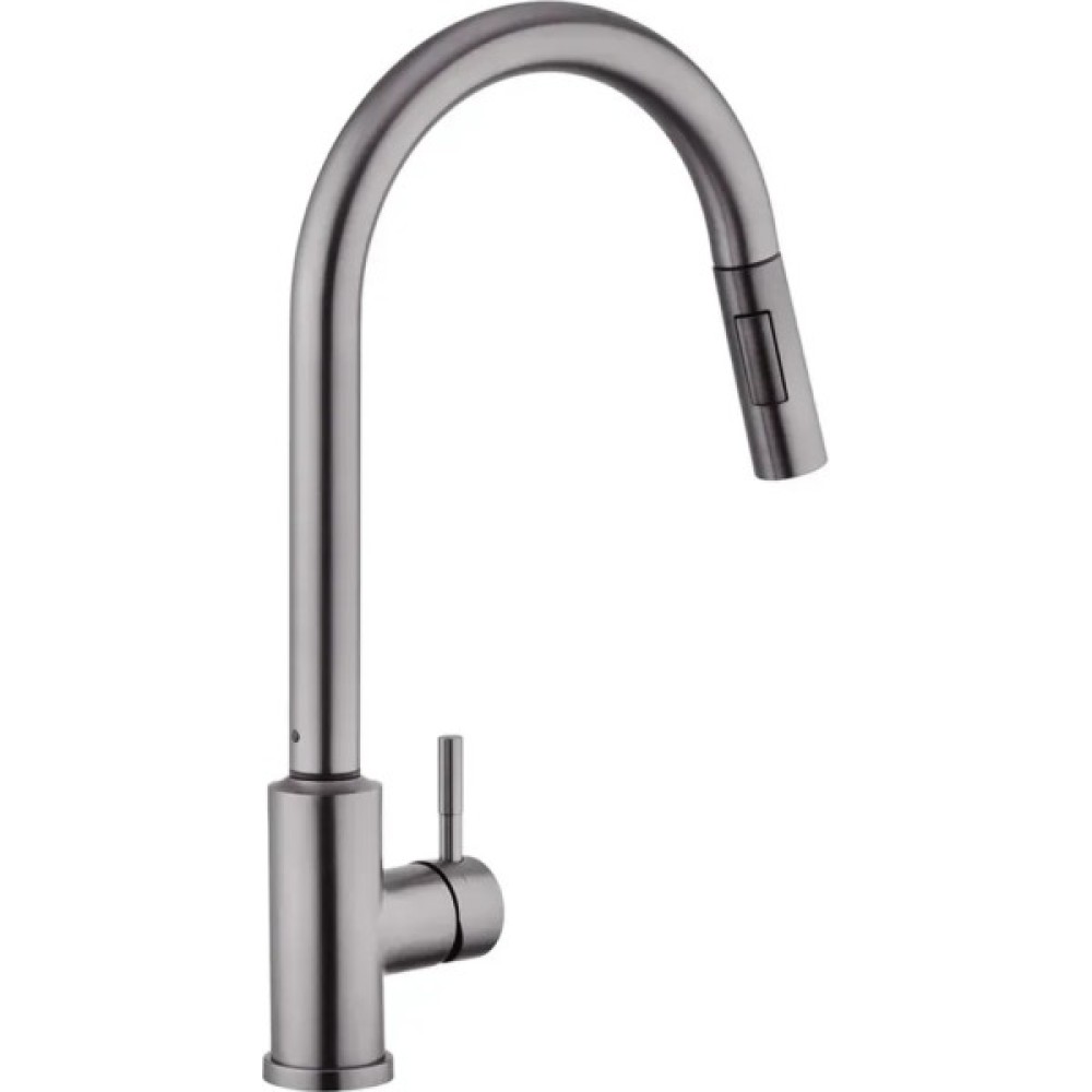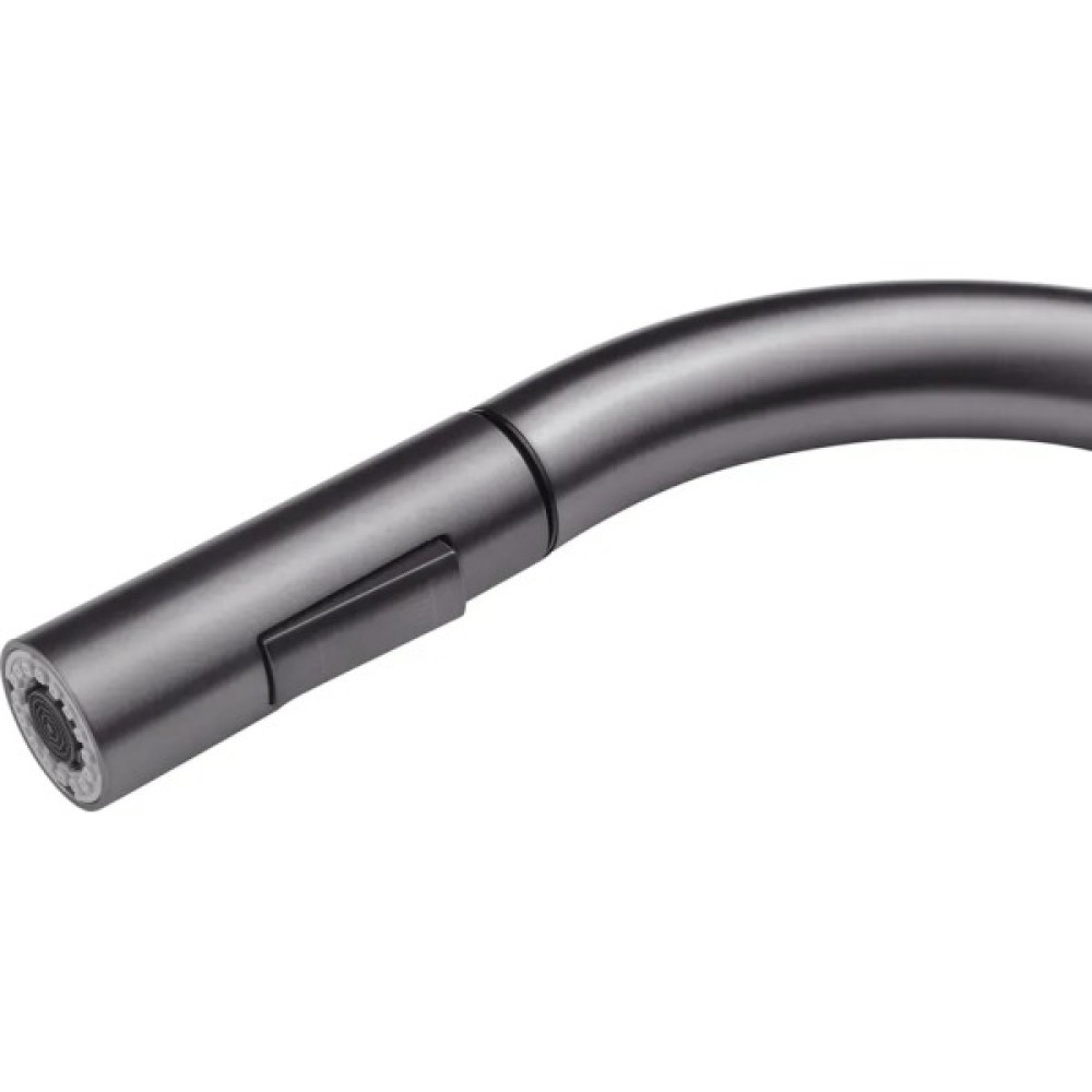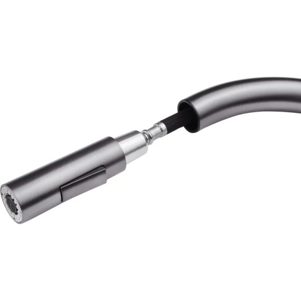 Змішувач має лаконічний дизайн та високу функціональність. Висувна лійка має шарнір, що забезпечує обертання на 360 градусів. Два режими розпилення – від потокового струменя без бризок до потужного струменя душу – дозволяють ефективно виконувати різні завдання, такі як ополіскування посуду або видалення забруднень.