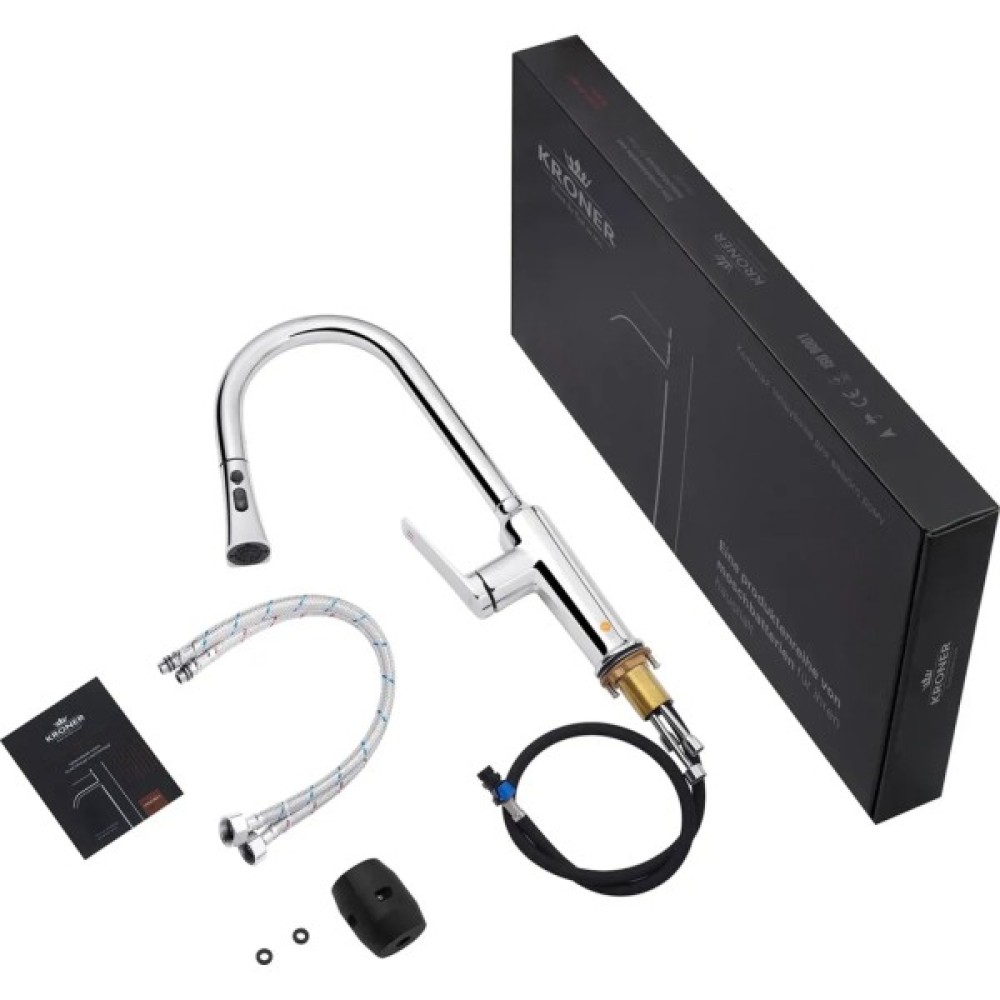 Особливістю Kroner KRP Makon - C030-T є наявність двох режимів подачі води — звичайний струмінь і душовий режим, що дозволяє вибрати оптимальний варіант для миття посуду чи продуктів. Керамічний картридж діаметром 35 мм забезпечує плавне регулювання температури та напору води, роблячи експлуатацію змішувача легкою та приємною.