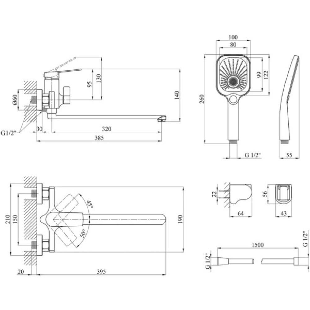 Комплект поставки змішувач; душовий шланг; кріплення; тримач для душу; інструкція; лійка для ручного душу