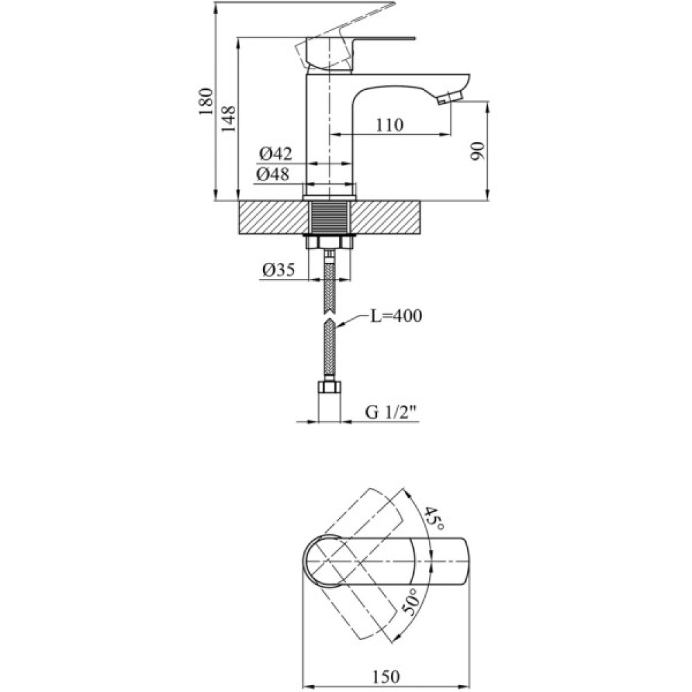 аератор; гнучка підводка; керамічний картридж 35 мм; витрата води до 13 л/хв