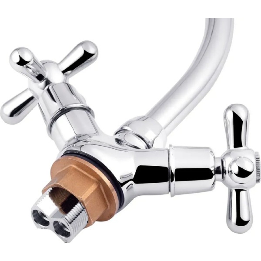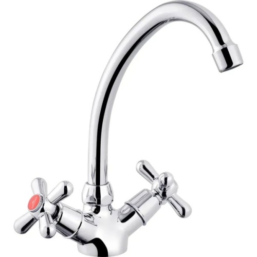 Змішувач для кухні Kroner KRP Royce - C030 виготовлений з високоякісної харчової латуні, яка стійка до впливу корозії, ударів і появи тріщин. Глянсове хромоване покриття не тільки підвищує довговічність змішувача, а й надає йому привабливості. Змішувач має вентильне управління, за допомогою якого можна відрегулювати температуру і натиск холодної та гарячої води. Виконаний в сучасному дизайні з поворотним виливом, який ідеально доповнить інтер‘єр кухні.