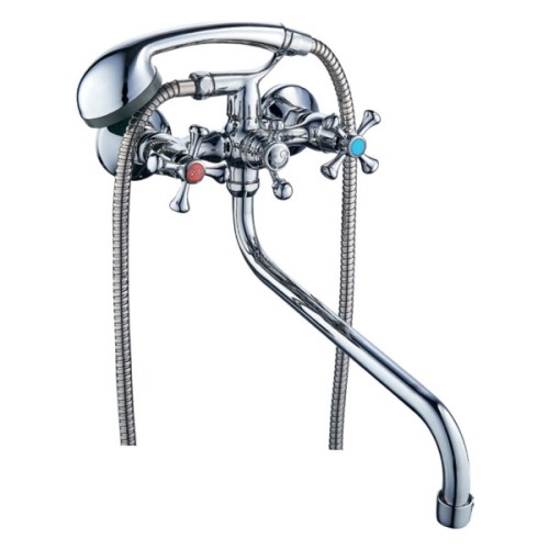 Двовентильний, настінний змішувач для ванни VN-5C460C в хромованому кольорі від Tau, має поворотний вилив з виносом 31.1 см, обладнується переднім перемикачем ванна/душ, встановленим на корпусі тримачем для ручної лійки з інтегрованим із ним бічним відводом для під'єднання душового шланга під діаметр 1/2", і встановлюється на два отвори за допомогою ексцентрикового з'єднання під діаметр 1/2".