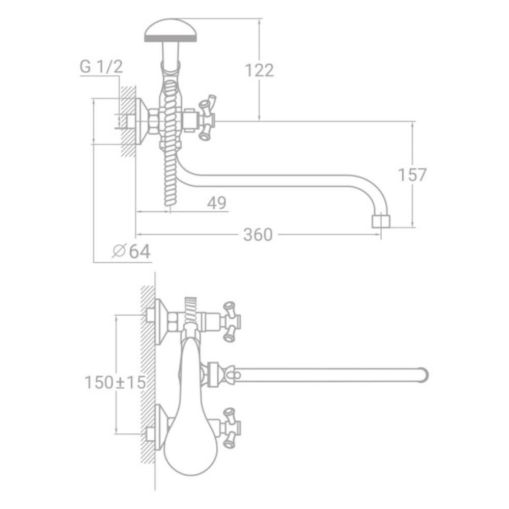 Додаткові характеристики тип кріплення: ексцентрики під діаметр 1/2"; шланг для душу у металевому обплетенні завдовжки 150 см; передній перемикач ванна/душ; кран-букса; верхній тримач для ручної лійки на корпусі; бічне відведення для під'єднання душового шланга під діаметр 1/2" інтегрований з тримачем для ручної лійки; однорежимна, кругла ручна лійка