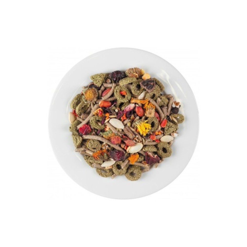Корм має унікальний склад, містить трав'яні гранули, добірне зерно, цілющі трави, горіхи, а також інгредієнти з природного ареалу проживання морських свинок. До складу раціону увійшло 23 інгредієнти, зокрема насіння, сушені фрукти, овочі, ягоди, а також улюблені делікатеси — фенхель, кунжут, паприка, коріння лопуха. Корм містить червоний протеїново-мінеральний гранулят, який покращує загальний стан здоров'я, сприяє зміцненню зубів і кісток, поліпшенню стану хутра.