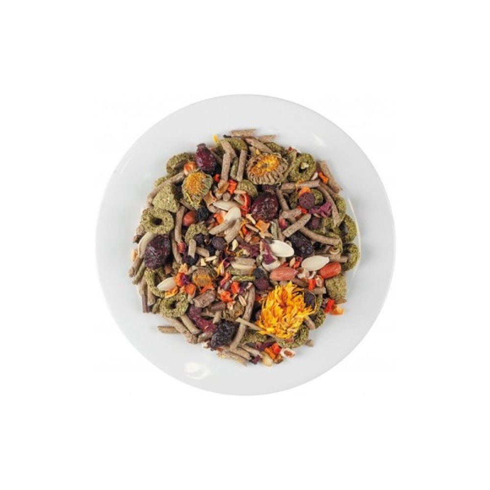 Склад: комбікорм, трав'яний гранулят в асортименті, овес голозерний, маїс, протеїново-мінеральний гранулят, насіння розторопші, повітряна пшениця, сушений гарбуз, яблука сушені гранульовані, сочевиця червона, гібіск, сушений буряк, морква сушена, насіння гарбуза, шипшина, кероб подрібнений, глід, квіти календули, аронія, арахіс, пастернак сушений, насіння льону